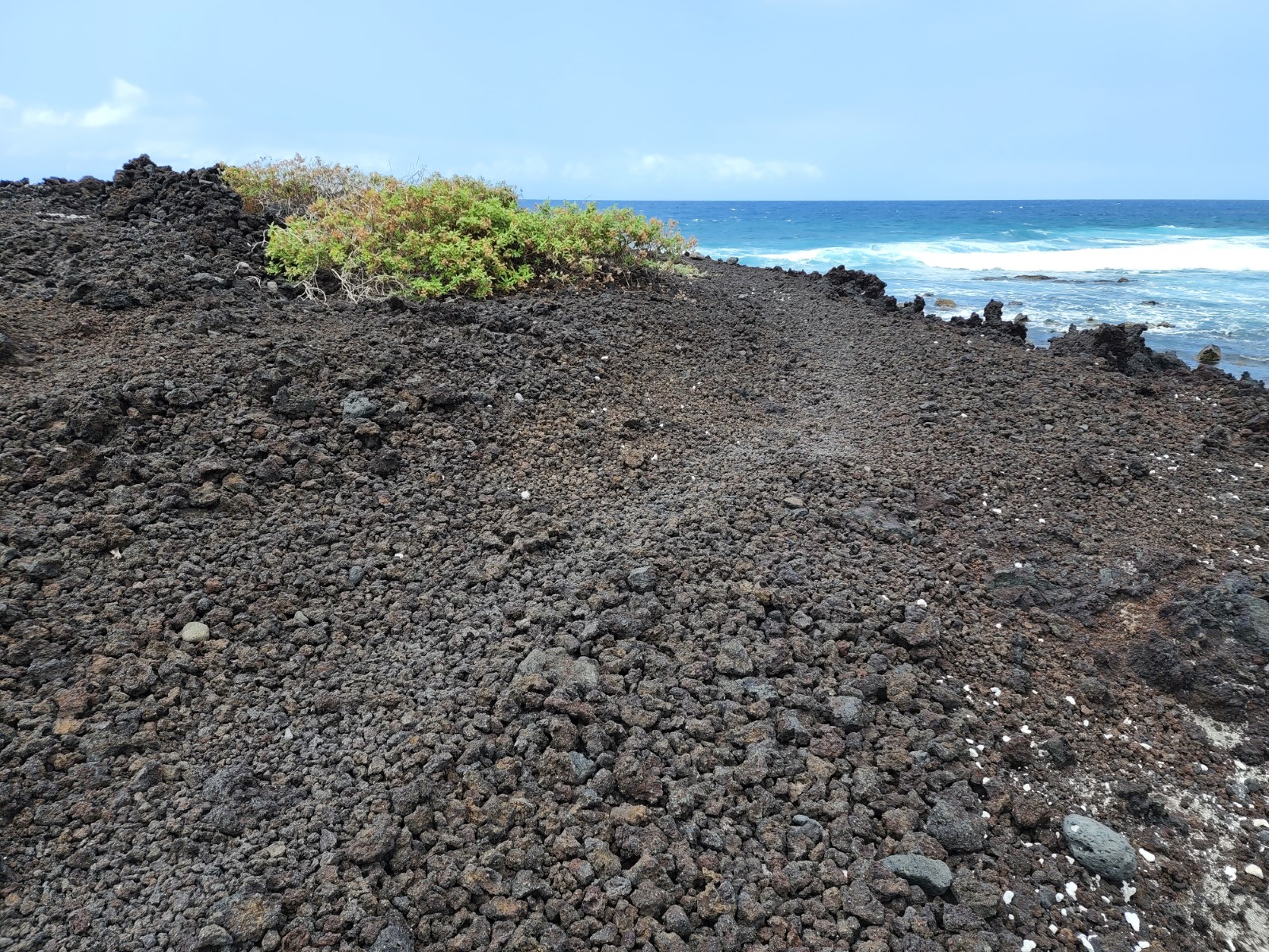 The unsigned entrance to Road to the Sea is between the 79 and 80 mile markers on Highway 11 just north of the gated Kona Garden Estates. The coordinates for the road entrance are 19.09611, -155.80261.