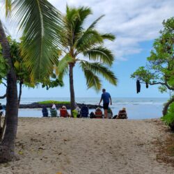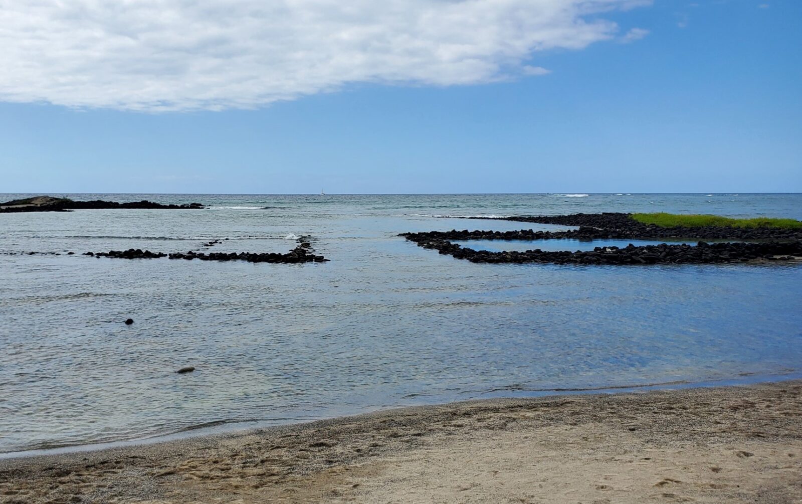 Built on Maliu Point next to Aiopio Beach is Hale o Mono Heiau, an historic Hawaiian temple platform. Other ancient structures are all around and a re-creation of a thatched roof shelter is right on the beach. To the north outside the fishtrap you’ll find some of the best tidepools in the area. A shoreline path continues in that direction to a sandy beach in front of Aimakapa Fishpond called Honokohau Beach.