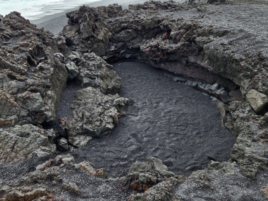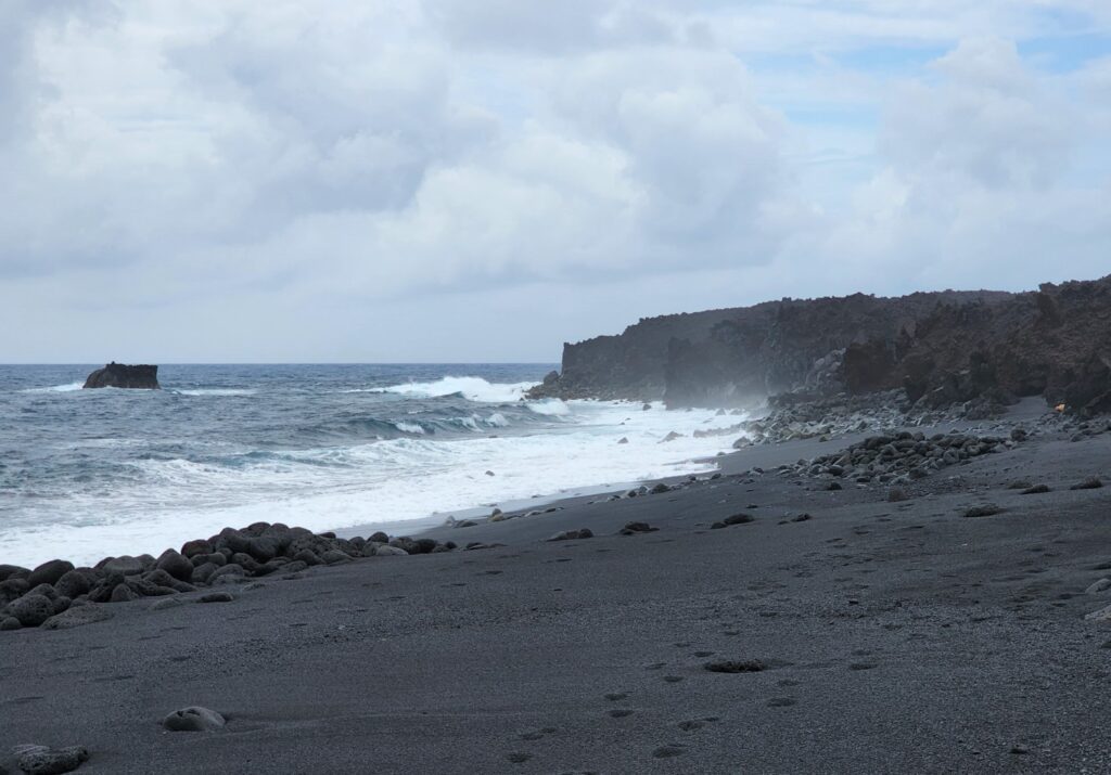 Getting to the trailhead is a long drive from just about any starting point on the island. See our map for the trailhead. Park near the intersection of Hwy 132 and Hwy 137 (now just a bend in the road) and climb eastward up over the lava. If it’s not foggy you should see the white light tower in the far distance. Follow a very rugged trail (ATV track) over the new lava toward the tower. Soon you’ll find the old level dirt road which heads straight to the light tower. From there, walk due south toward the ocean on a gravel road and you’ll find the new black sand beach to your right. It’s difficult to loop back to the access road so going back the same way you went in is the best plan.