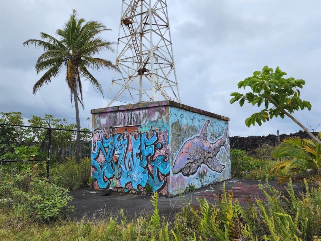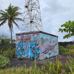 The Cape Kumukahi light structure isn’t a typical lighthouse. It’s a lattice/skeleton steel tower with a platform near the top that elevate the light to around 125 feet above the ground. The light tower was completed in 1934 and has been painted white to make it easier to see. It was somehow spared during the 1960 lava flow which came within mere feet on all sides of the base. The lightkeeper’s home and the other Coast Guard buildings were destroyed however. After that lava flow was over, the Coast Guard brought power lines to the light to automate it. Visitors can walk around the tower, but not get on it or go up it.