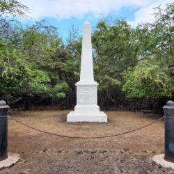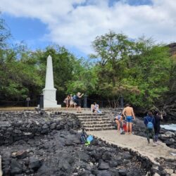 A tall white obelisk monument was erected in 1874 in honor of Captain James Cook who was killed near this spot by skeptical Hawaiians on the 14th of February, 1779. The monument is actually on British property and is roped off to keep visitors from touching it. It’s still easy to photograph and is even visible from Napo’opo’o Beach Park across Kealakekua Bay. A small concrete jetty was also constructed at this location by the Commonwealth of Australia to commemorate Captain Cook.