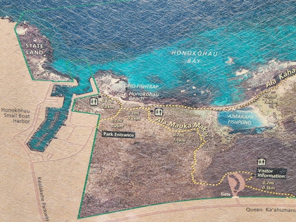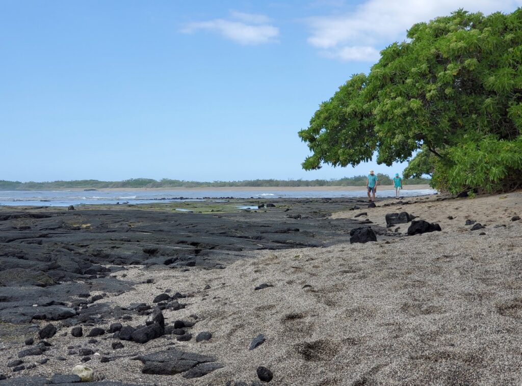 There are three ways to get to Honokohau Beach. The shortest option is to park in the parking area for Aiopio Fishtrap Beach at the NW corner of Honokohau Harbor and walk into the park from there. Follow signs on the path for Aimakapa Fishpond and you’ll be at Honokohau Beach in about a half mile of walking. Look for excellent tide pools along the way. The other two options are (1) the parking lot for the national park visitor center off Highway 19 and (2) the parking lot for Kaloko Fishpond. Both of those are about one mile of walking each way, so twice as far, but they are pleasant walks.