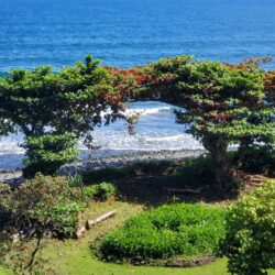 Honolii Beach is a mix of sand and smooth rocks both big and small. Driftwood gathers on the back of the beach, but there’s a lot of space to set out towels or beach chairs to watch the surf. You’ll also find abundant lawn space surrounded by trees of various varieties.