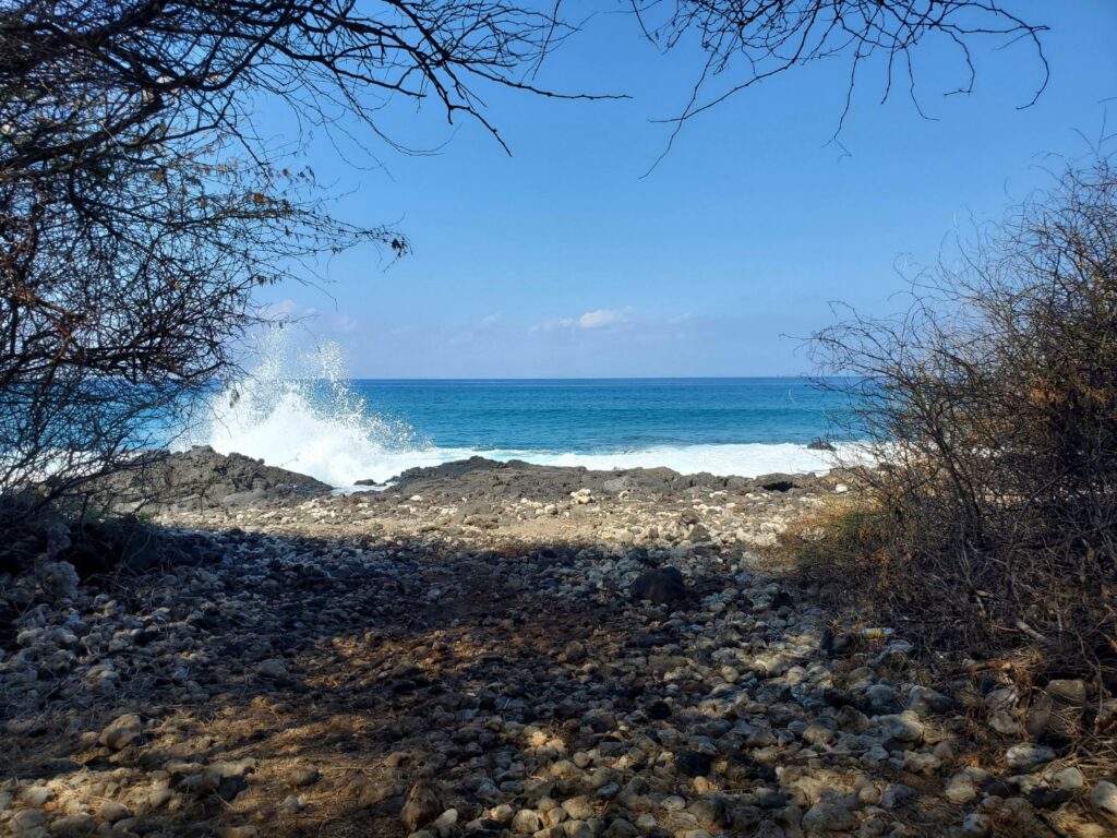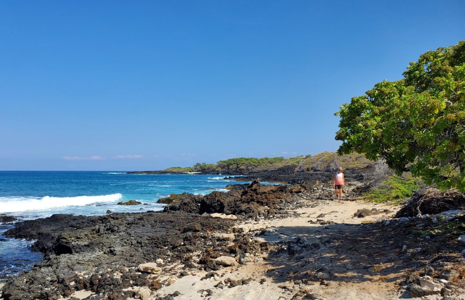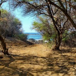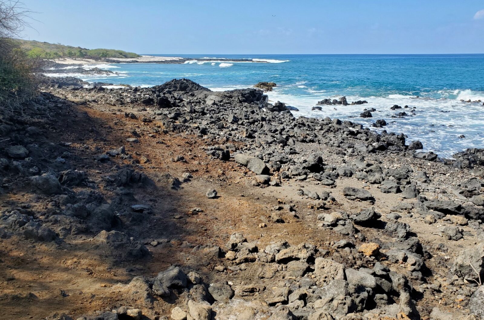 From that parking lot look for a crude foot trail that heads straight toward the ocean. When you reach the dirt road behind the beach turn left and walk about 1000 feet to the sandy beach and the best water access. A lot of this coastal path is on broken bits of white coral with a few pieces of black lava scattered in.