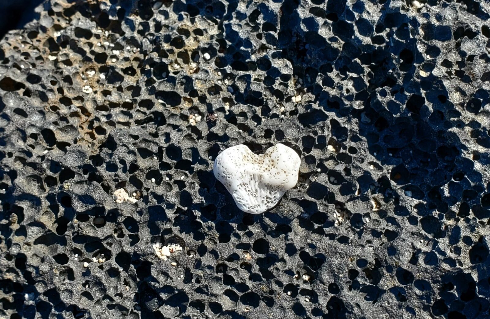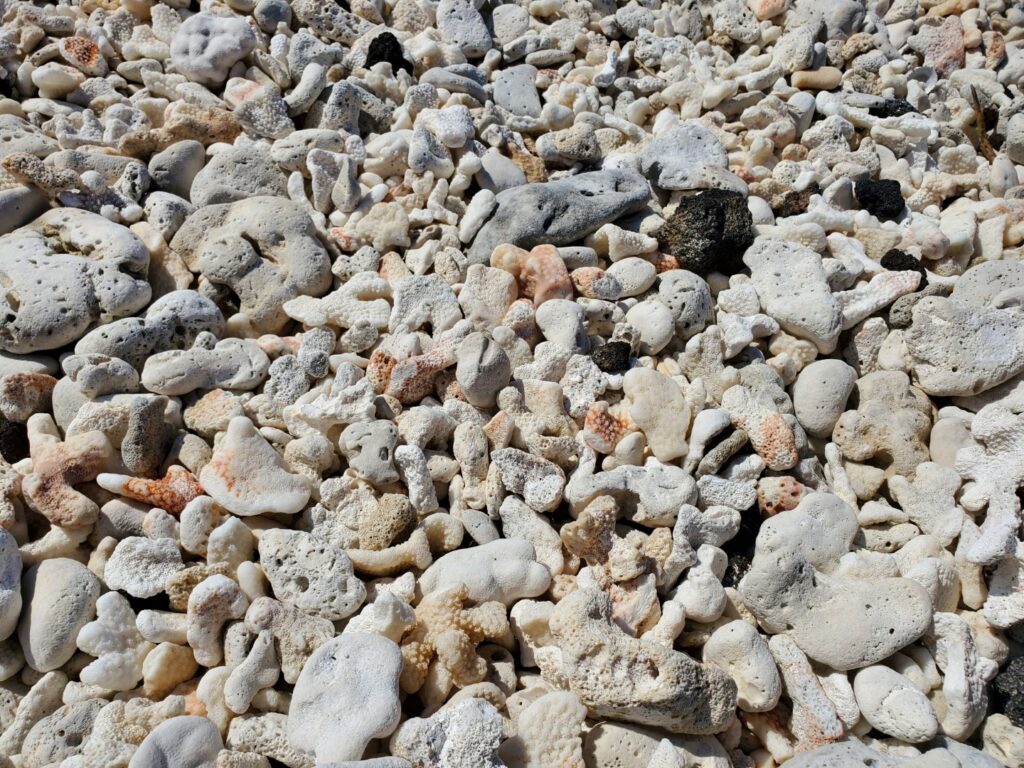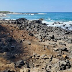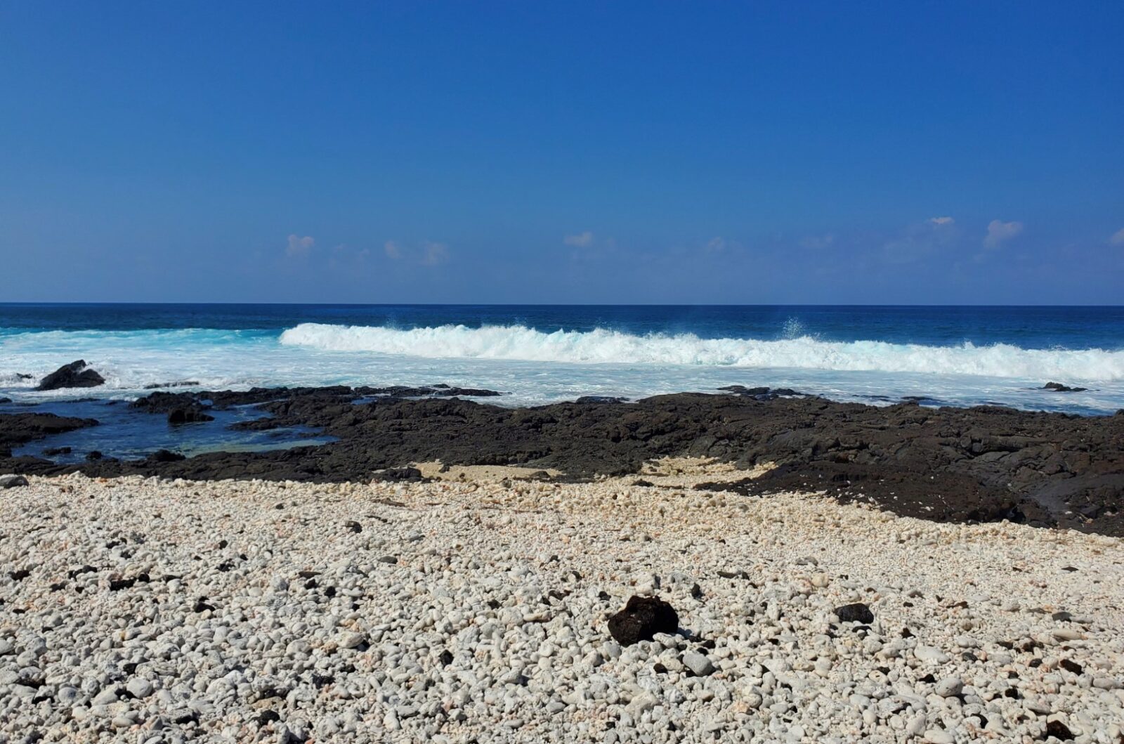 From that parking lot look for a crude foot trail that heads straight toward the ocean. When you reach the dirt road behind the beach turn left and walk about 1000 feet to the sandy beach and the best water access. A lot of this coastal path is on broken bits of white coral with a few pieces of black lava scattered in.