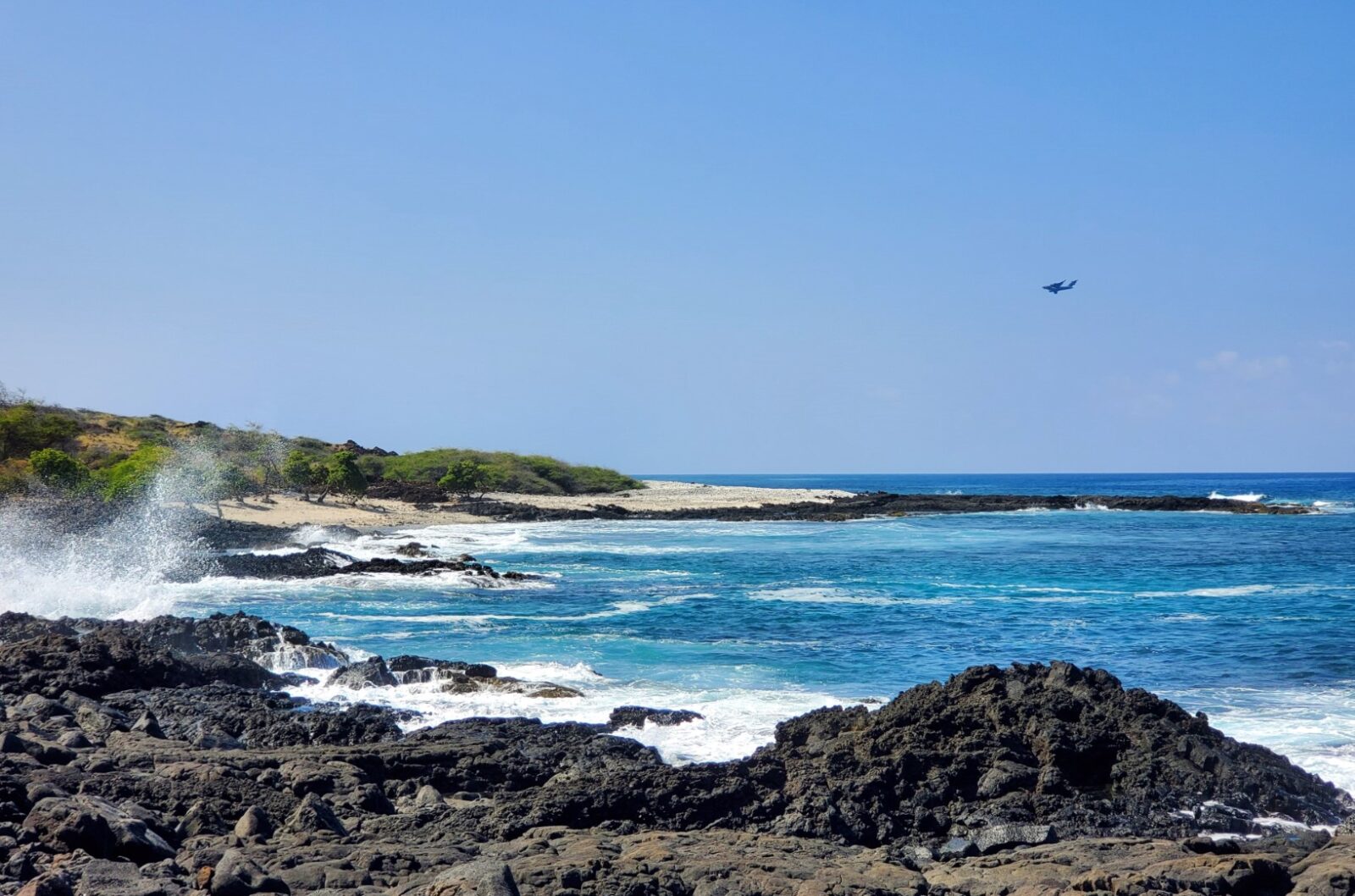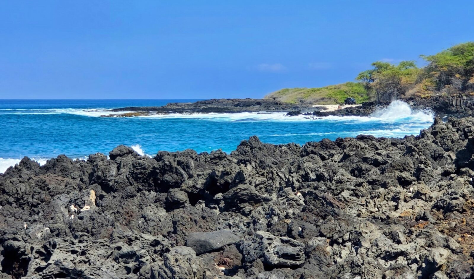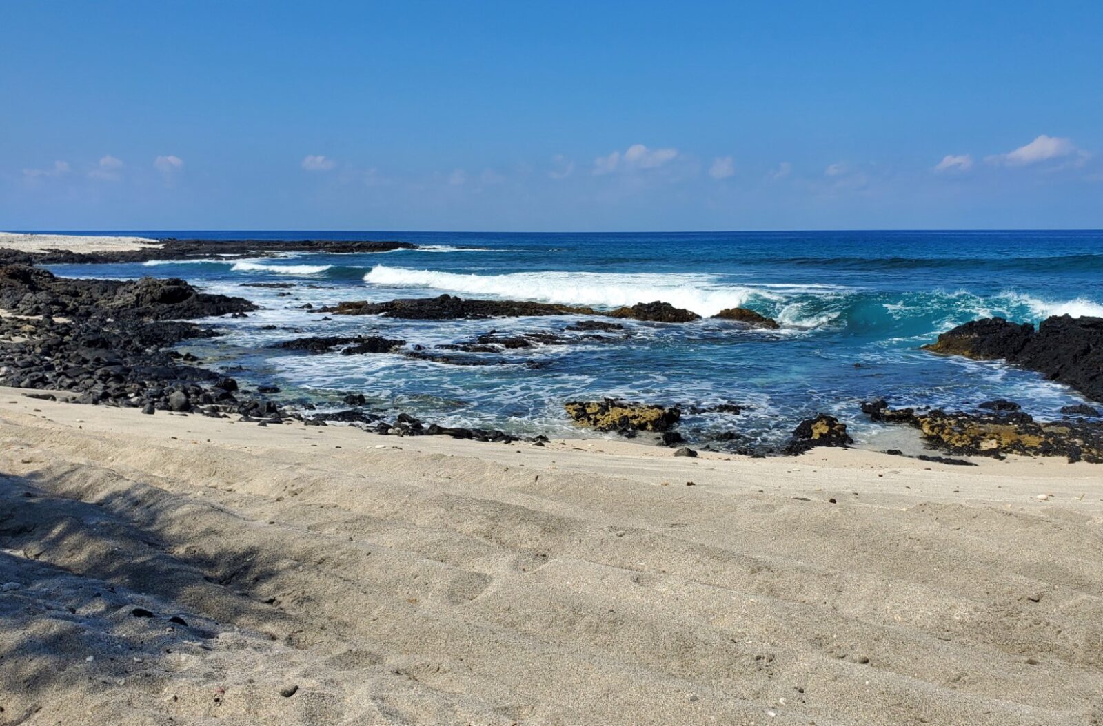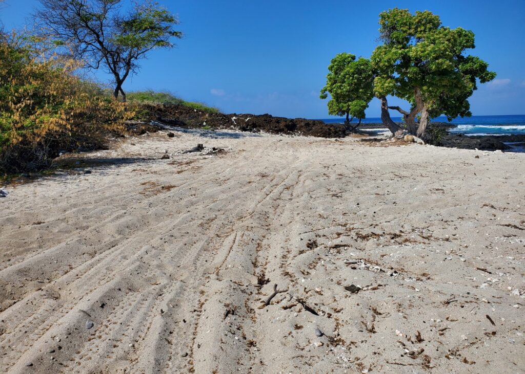 This is not your typical sunbathing beach. There’s even a chance that a local crew driving a 4×4 rig with huge tires might get right down to the beach and force you to move your towel. It’s super hard to get to the shore of Kahoiawa Beach with a vehicle so it’s not a common problem even though you’ll probably see tire tracks in the sand. Chances are that you won’t be driving one of those crazy off-road rigs so we recommend that you don’t even try to drive. Even with a rental Jeep Wrangler you’ll only get about as close as the nearest parking lot which is on the Kua Bay Access Road. See our map below for the location of that suggested parking lot. It’s the same lot for hiking up to the summit of Pu’u Ku’ili, a tall red cinder cone that has excellent views of the area (a hike we highly recommend). You’ll find this parking lot on the left 0.7 mile down the Kua Bay Beach Road from Highway 19.
