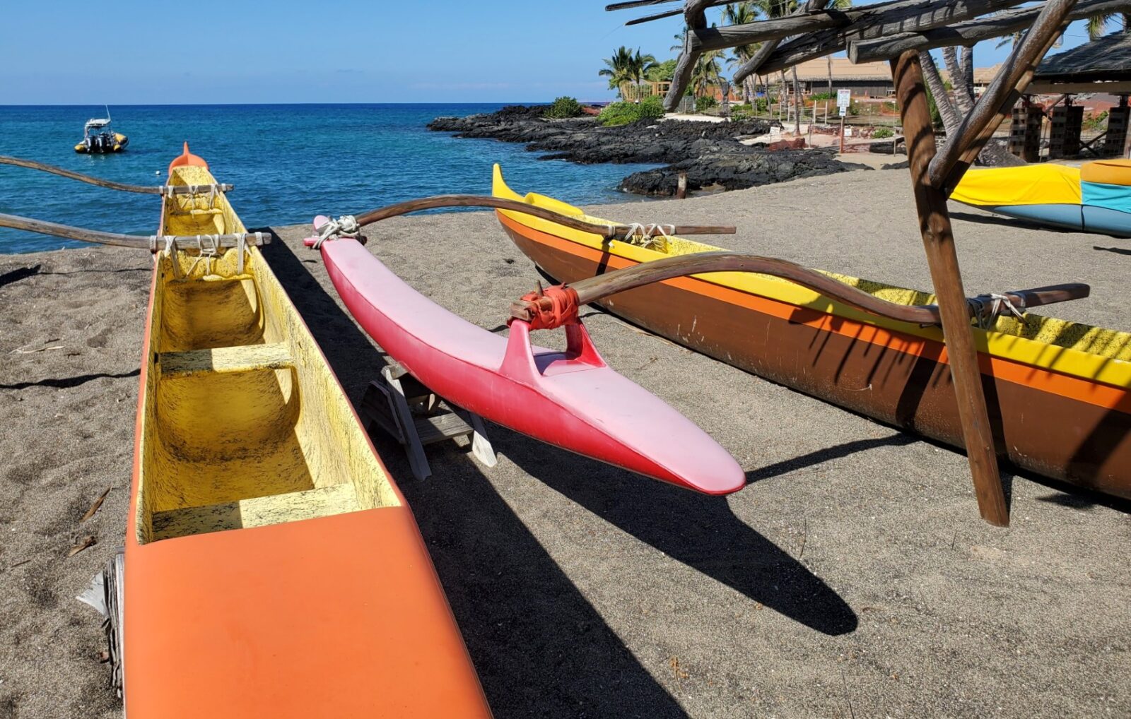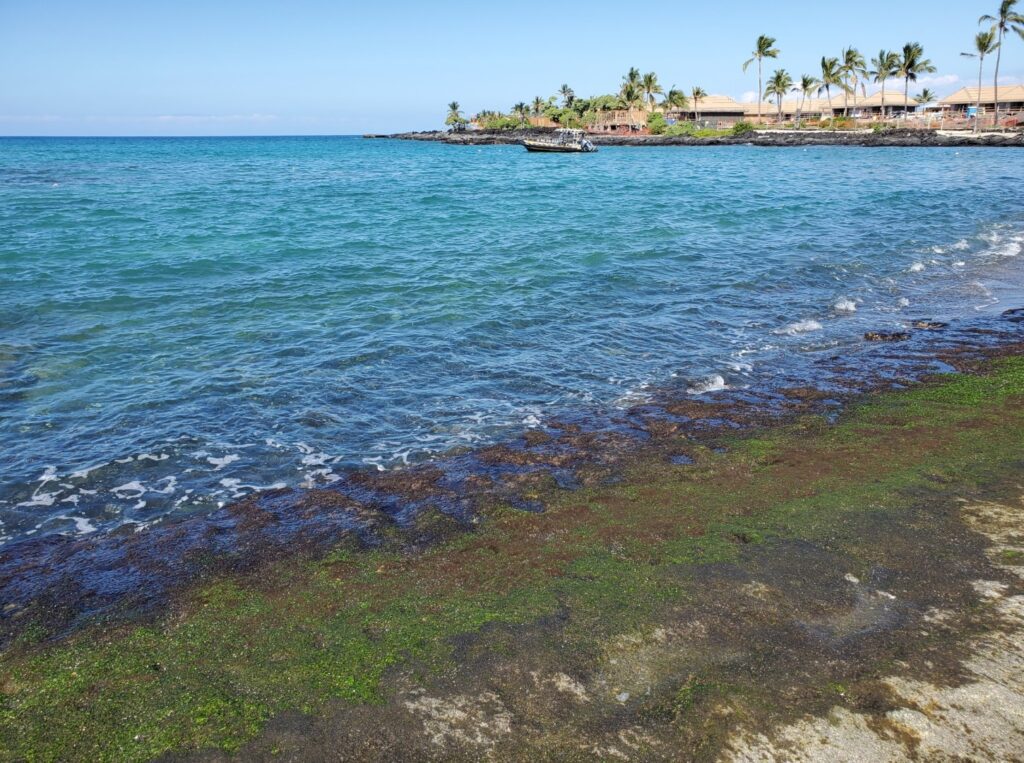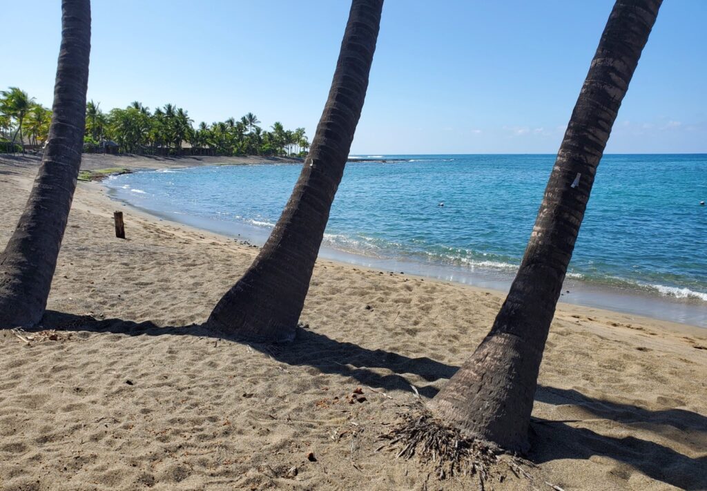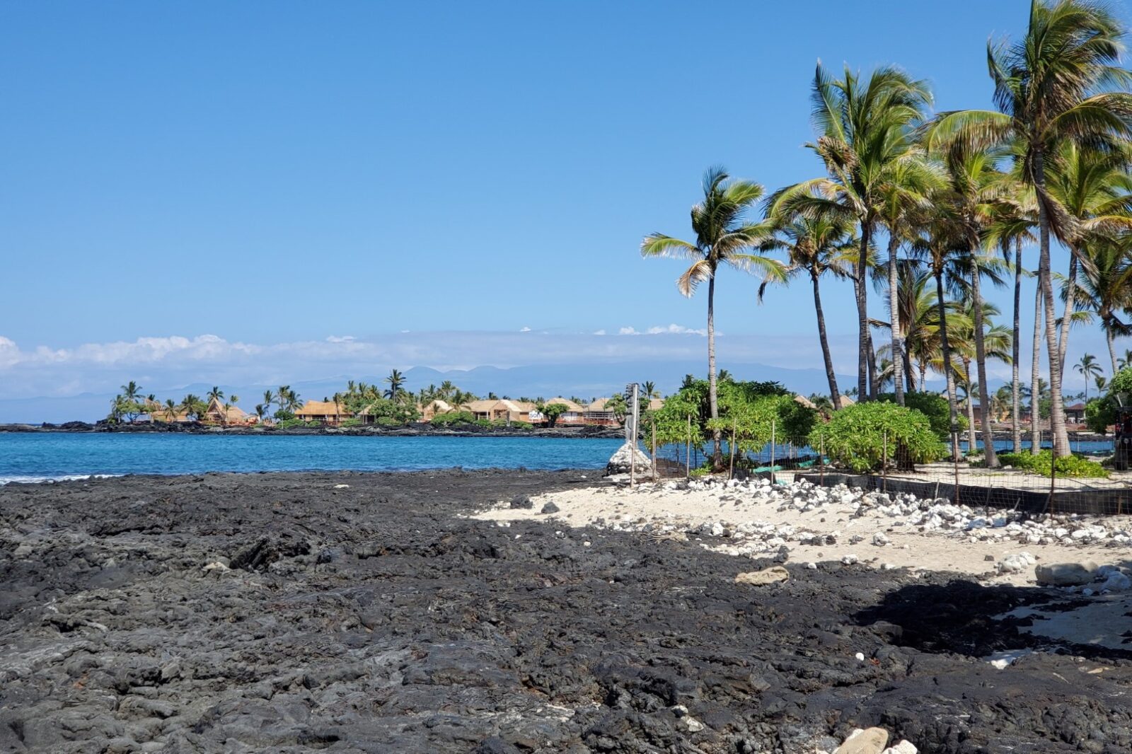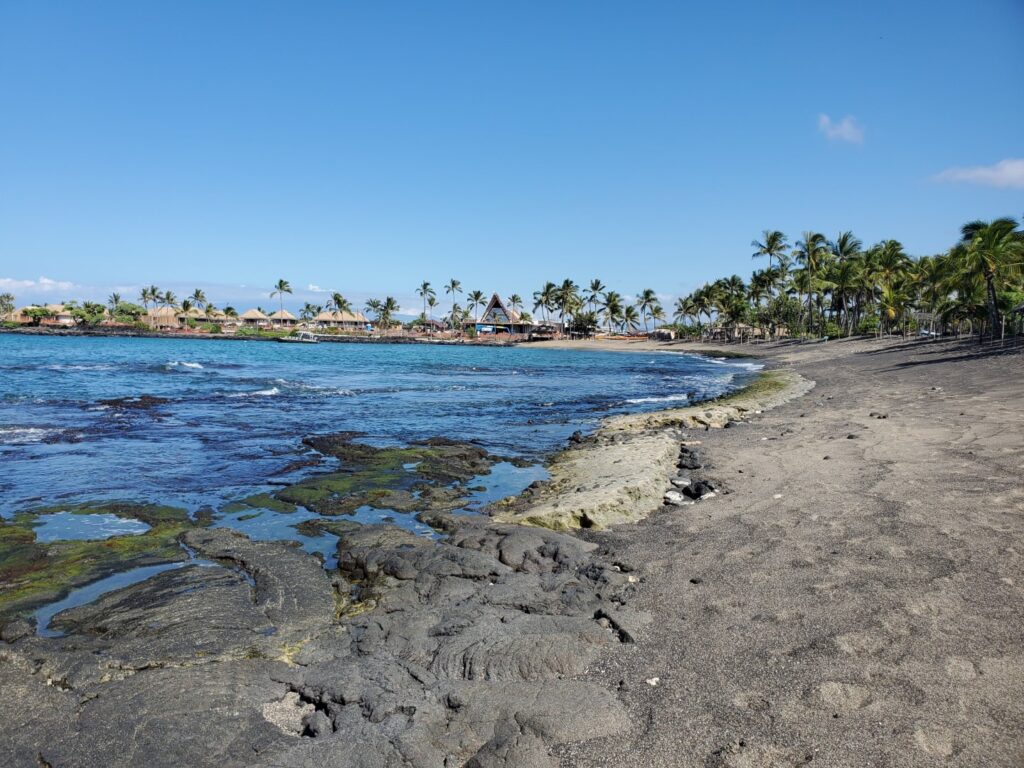 Kahuwai Beach, aka Kona Village Beach, is a narrow dark sand beach on Kahuwai Bay in front of the Kona Village Resort. It isn’t visited much these days due to unsightly fences and ongoing construction, but hopefully that will change in 2023.