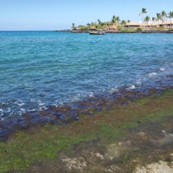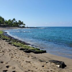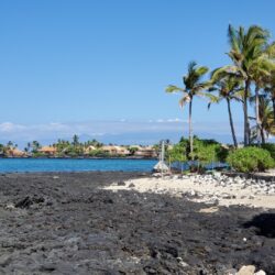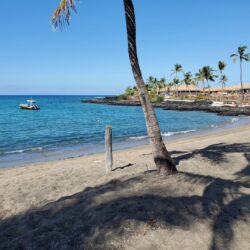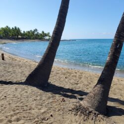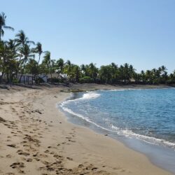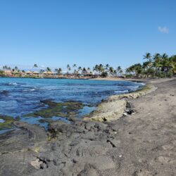Kahuwai Beach, aka Kona Village Beach, is a narrow dark sand beach on Kahuwai Bay in front of the Kona Village Resort. It isn’t visited much these days due to unsightly fences and ongoing construction, but hopefully that will change in 2023.
