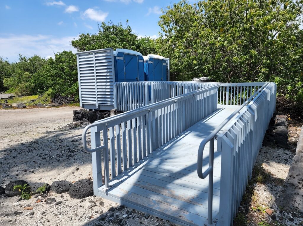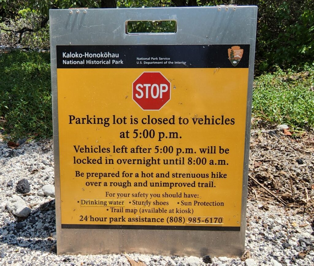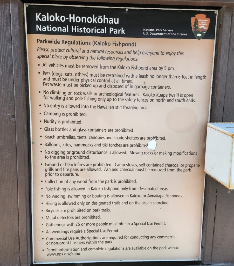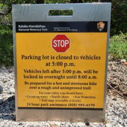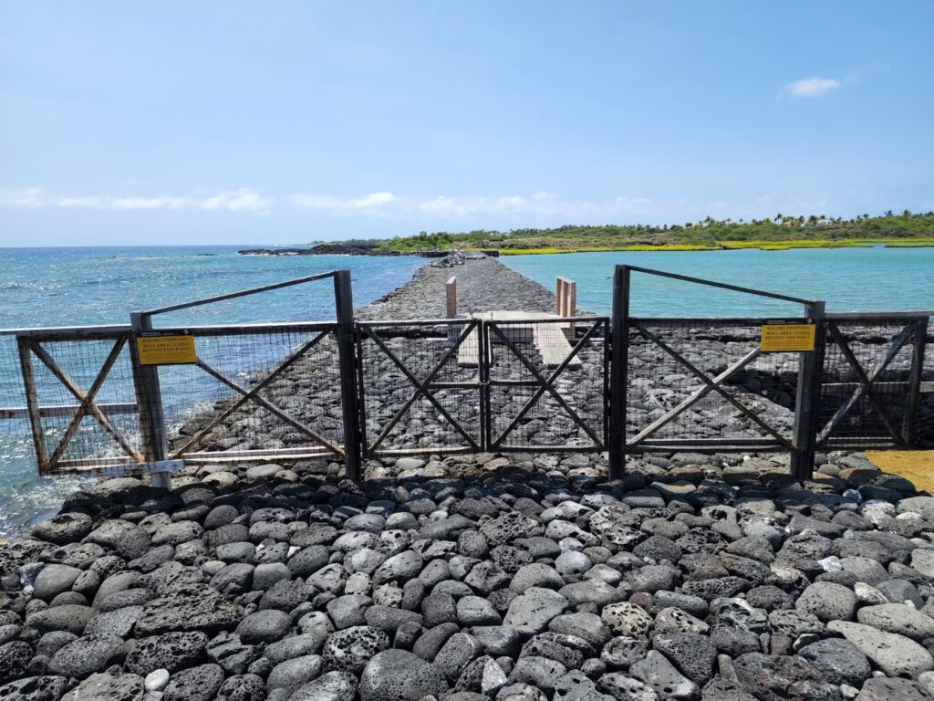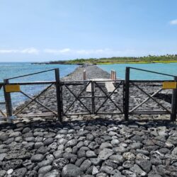 The entrance for Kaloko Fishpond starts on Highway 19 across from the industrial center north of Kona where the Costco is. If you are driving north on Hwy 19 you’ll need to turnaround somewhere and drive southbound as there is no turn lane for this entrance from the northbound lanes. It’s not well signed, but the road name is Ala Nui Kaloko. You’ll know you are on the right road if it is not paved and you see a gate with the national park name on it. Note that this gate closes at 5pm so don’t get your car trapped inside when they lock it. This gravel road ends at a parking lot at the south end of the fish ponds. Toilets and picnic tables are provided by the park service.