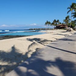 Ka’upulehu Beach is the long sandy beach in front of the Four Seasons Resort Hualalai. It’s a half-mile long and sandy, but it’s narrow in all but a few areas. A walkway meanders behind the beach making it easy to scan the beach for a place to stop. The resort provides lounge chairs all along the beach for their guests so you’ll have to find an open space between them. A great place to set up for the day is near the middle of the beach. In that vicinity you’ll find a couple restaurants and bars and a small store with beach goodies and shaved ice.