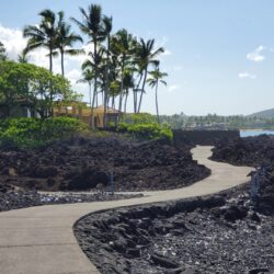 Fortunately it’s just a short walk to Kaupulehu Beach from the Four Seasons parking lot, but unfortunately only 10 public parking spaces are provided and they’re in their employee lot and they tend to be full. Our map shows the location of the shoreline public access parking spaces (you can put these coordinates into google maps too: 19.8286, -155.9894). Those spaces are clearly signed when you get to them and it’s worth checking them if you want to hang out on the beach at the Four Seasons. If they are all taken, your other option is to park at Kukio Beach which has a larger public lot and then walk a coastal pathway between lava rocks and the Hualalai Golf Course. This path isn’t that bad actually as it has numerous interpretive signs and it’s just a half-mile walk from Kukio to Kaupulehu Beach.