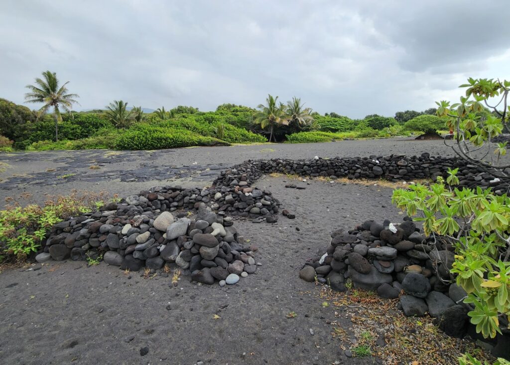 There are many historical structures all around Kawa Bay including some that were built right behind the beach. This site was inhabited many years ago because of Kawa Springs, a source of freshwater, which is near the beach. A huge heiau (ceremonial temple) called Ke’eku Heiau is located up high on the adjacent lava flow east of the beach. If you visit this structure, don’t enter it, just take photos from outside and be careful not to disturb anything and that goes for all the structures at Kawa. Also if you visit the anchialine freshwater springs, don’t enter them as they are home to shrimp and birds.