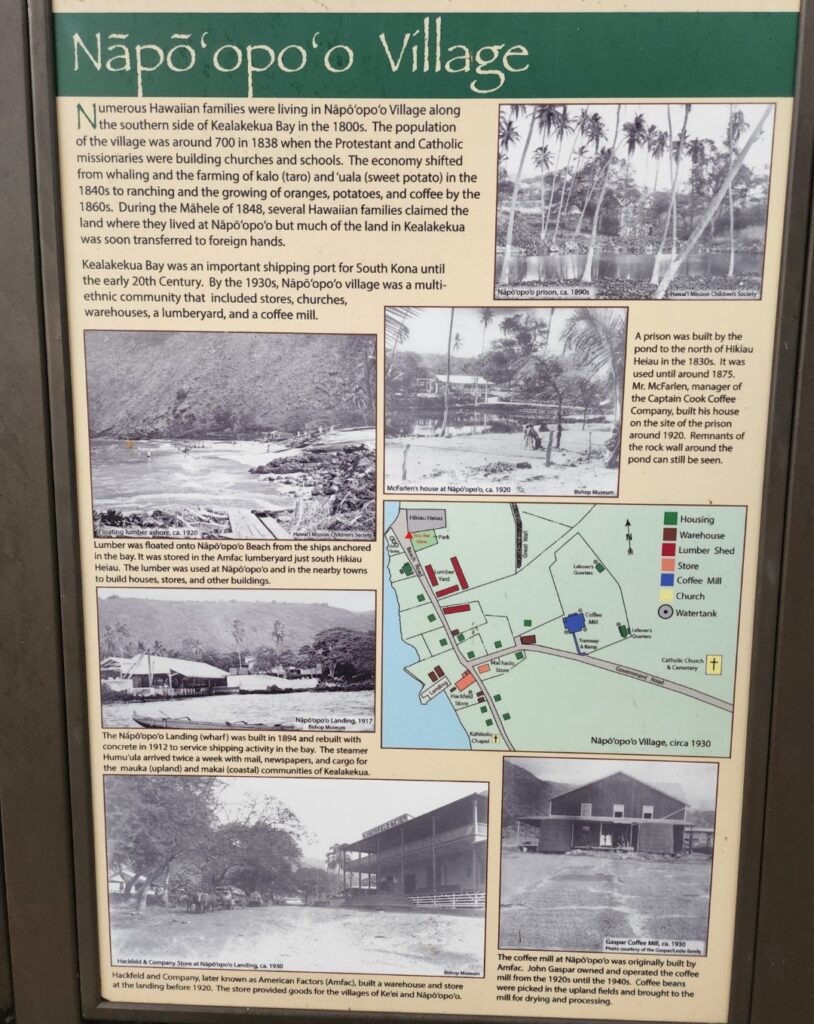 Getting to Napo’opo’o Beach is fairly straightforward. From the town of Captain Cook turn south onto Napoopoo Road (Highway 160) and follow it downhill to a T intersection with Puuhonua Road. Turn right and continue about 500 feet to the parking lot near the restrooms and a covered picnic area (across from the home at address 82-6049).