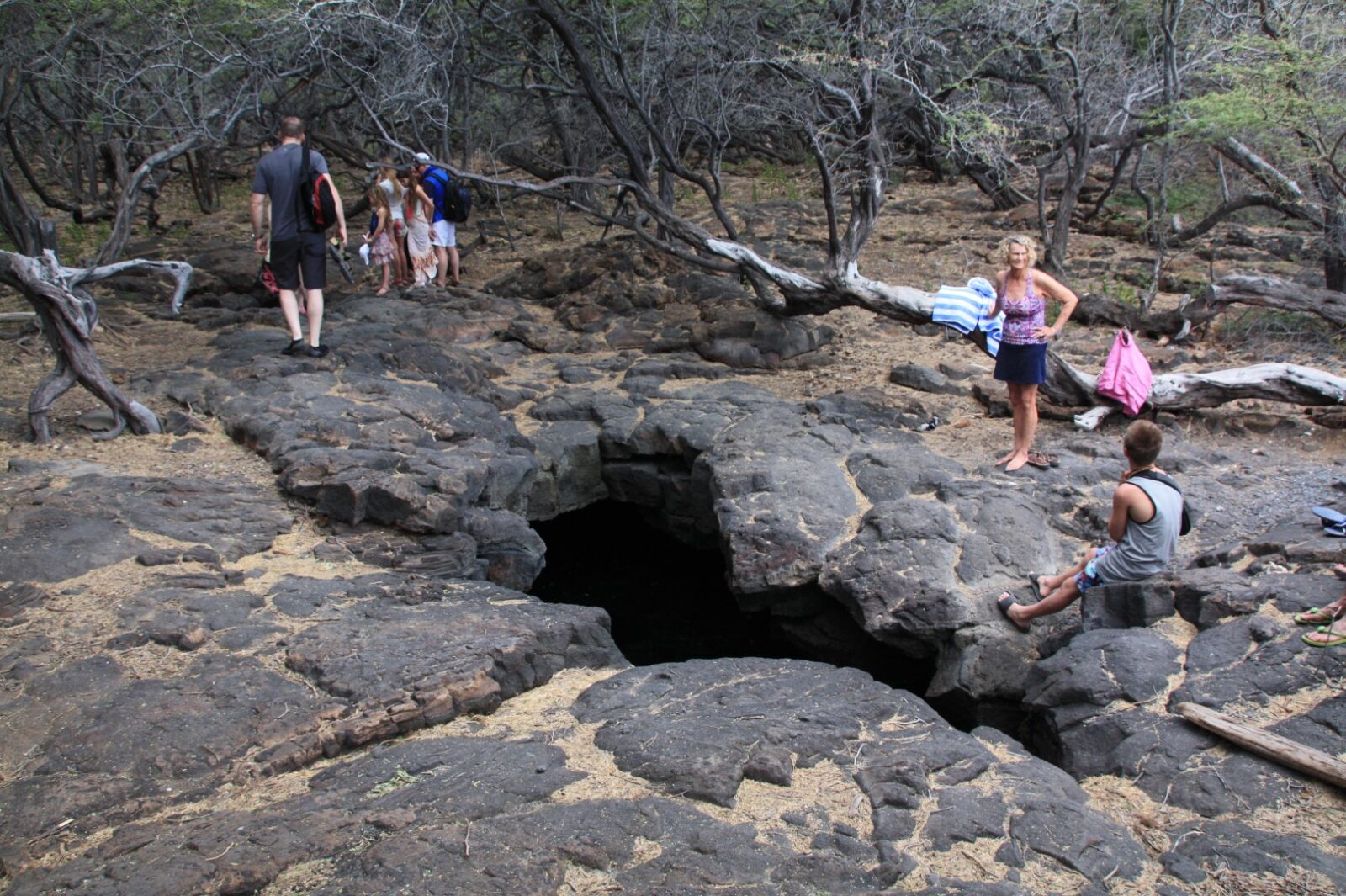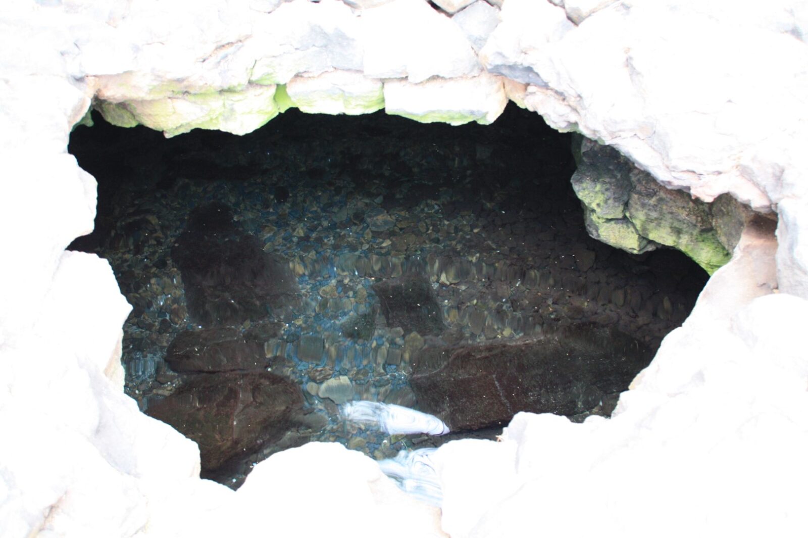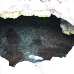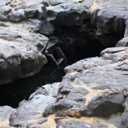 A small ladder helps visitors descend into the cave. The water is definitely cool, but you’ll get used to it pretty quickly after the initial shock. Explore around in the cave after your eyes adjust or carefully use the light on your phone to see the way. Two openings in the lava tube roof allow light to shine into this dark space. Petroglyphs have been carved into the walls where the cave extends inland beyond the pool.