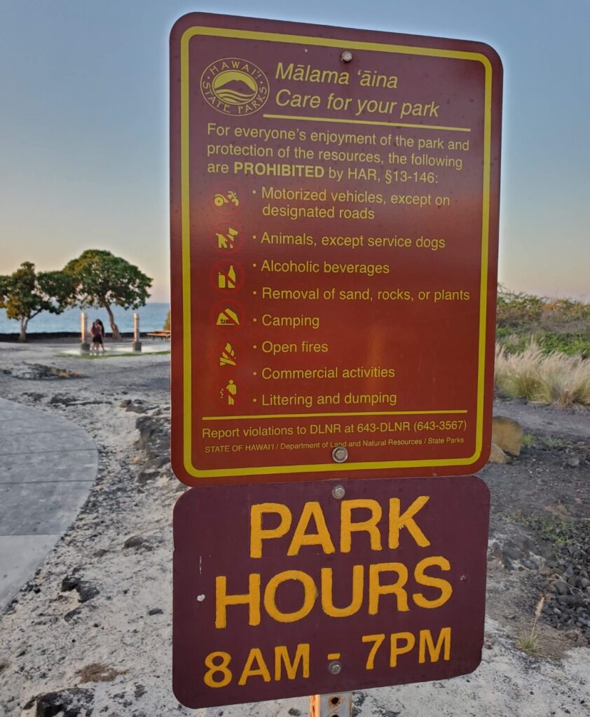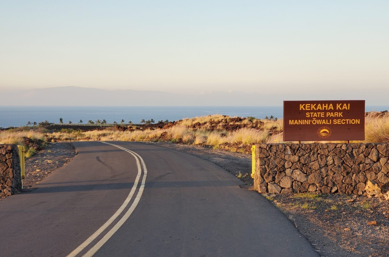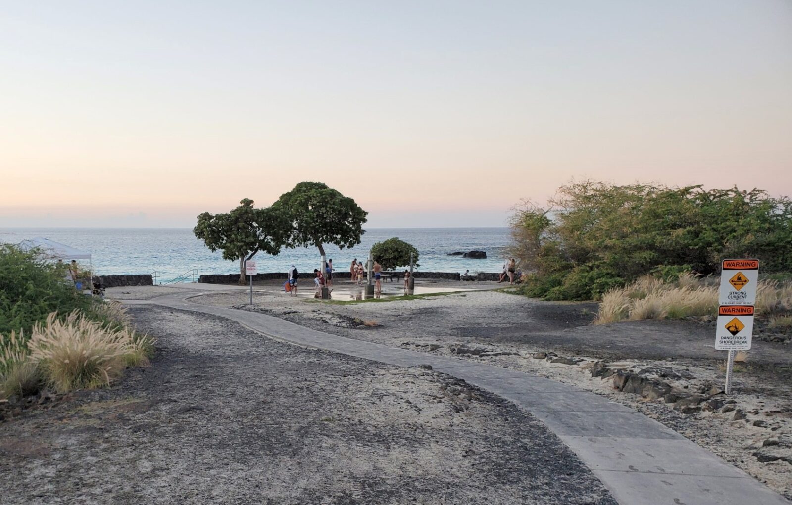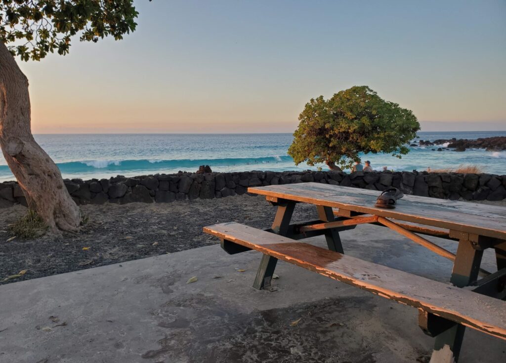 The road to Kua Bay isn’t well signed, but it’s across from the West Hawaii Veterans Cemetery which has huge signs on Highway 19. As you drive down to the beach the signs say “Kekaha Kai State Park Manini’owali Section” but it’s better known as Kua Bay (which is easier to say too). The drive is about 1.4 miles from the highway to the end of the road where there’s a loop to turn around. You’ll want to park as close to the turnaround as possible as that’s where the beach access and restrooms are located. If you want to go to the north end of the beach, hoof it across the lava road at the roundabout, otherwise just walk directly towards the ocean where you’ll find picnic tables perched on a plateau above the beach. The sandy beach is to the right of the picnic area, but if you are just here to watch the sunset, it’s a bit quieter on the left and there are a lot of places to set up beach chairs. The hours of Kua Bay are posted as 8am to 7pm but check the signs as you go in.