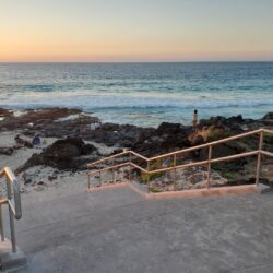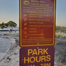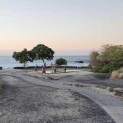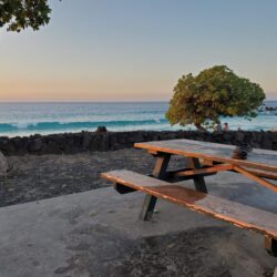 The road to Kua Bay isn’t well signed, but it’s across from the West Hawaii Veterans Cemetery which has huge signs on Highway 19. As you drive down to the beach the signs say “Kekaha Kai State Park Manini’owali Section” but it’s better known as Kua Bay (which is easier to say too). The drive is about 1.4 miles from the highway to the end of the road where there’s a loop to turn around. You’ll want to park as close to the turnaround as possible as that’s where the beach access and restrooms are located. If you want to go to the north end of the beach, hoof it across the lava road at the roundabout, otherwise just walk directly towards the ocean where you’ll find picnic tables perched on a plateau above the beach. The sandy beach is to the right of the picnic area, but if you are just here to watch the sunset, it’s a bit quieter on the left and there are a lot of places to set up beach chairs. The hours of Kua Bay are posted as 8am to 7pm but check the signs as you go in.
