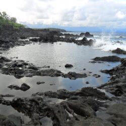 The Goddess Pond is located at Makaukiu Point about a quarter mile to the right (east). Just follow the lava shelf and you’ll find a large pool at the point that is just above the ocean. When waves hit the point they splash into the pool and refresh it. This is a great place to soak and relax in the sun. If the surf is high enough to create a flow in the pool, stay away as these pools and this shoreline can be very dangerous during those conditions.