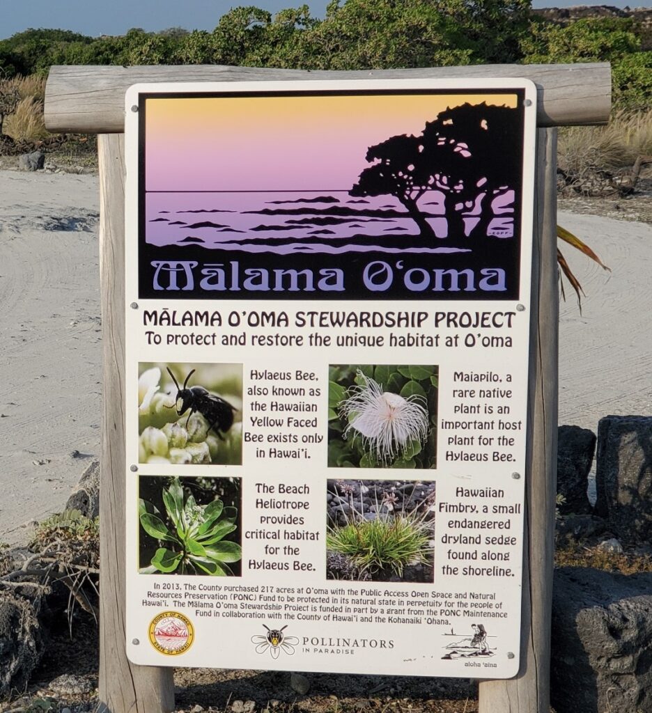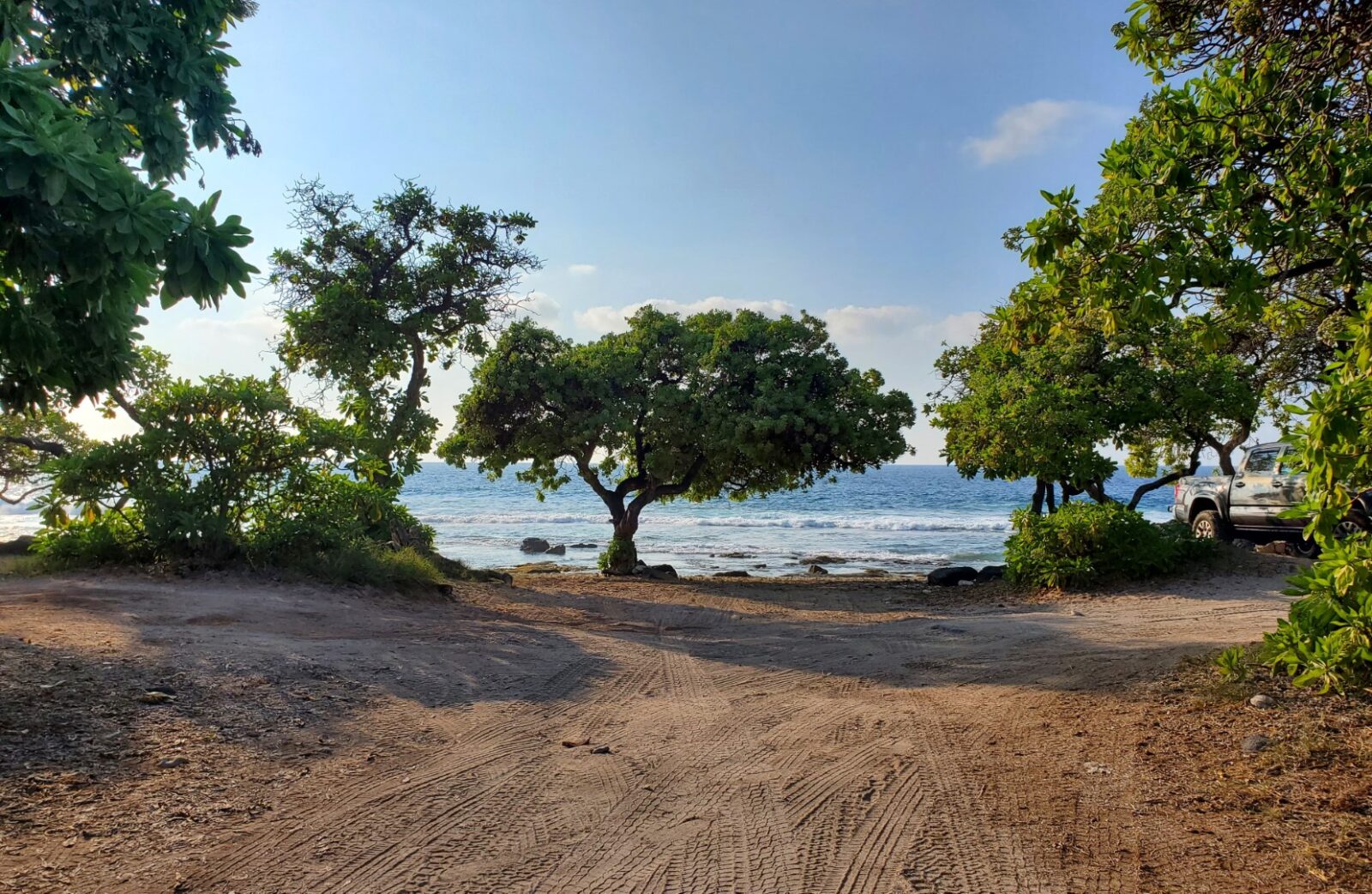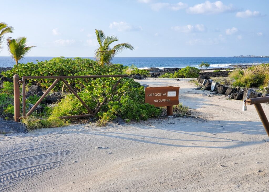 While this beach can be accessed from the north at Wawaloli Beach, the best access is from the south end as it avoids very rugged lava rocks in the road. To get to this southern access, turn toward the ocean off Highway 19 onto Hulikoa Drive and go right at the roundabout (the only option). Follow signs that say “Beach Park” and “Beach Access” as they point to the entrance for both O’oma Beach and Kohanaiki Beach Park. When the road gets to the shoreline there’s a paved parking lot on the right which is a good option for walking into Ooma. If you don’t mind driving a dusty road, there’s a road that goes northward just beyond the parking lot. Many locals take this road and park their vehicles under the shade trees just behind the beach. Make note of the time posted on the gate as you drive or walk in as they’ll close the gate then. Portable toilets are provided along this dirt road behind the beach.