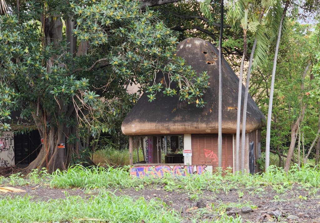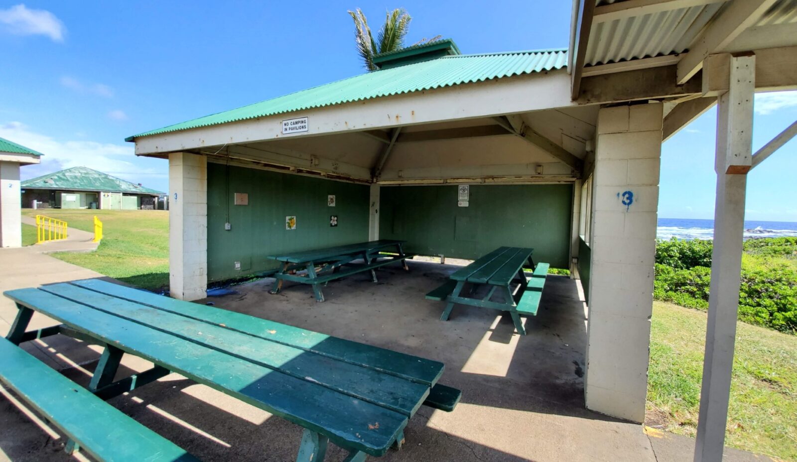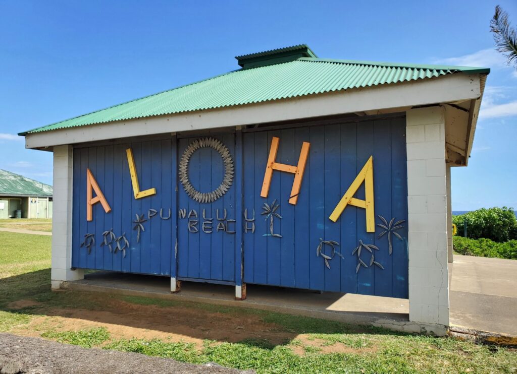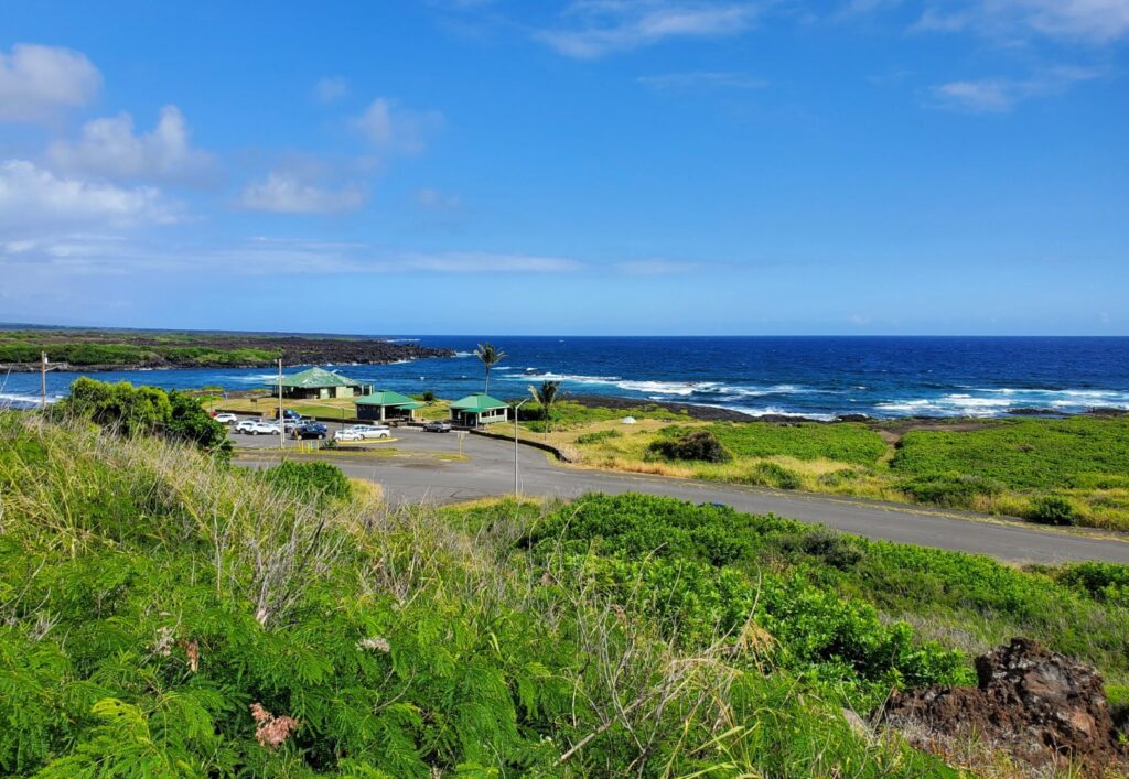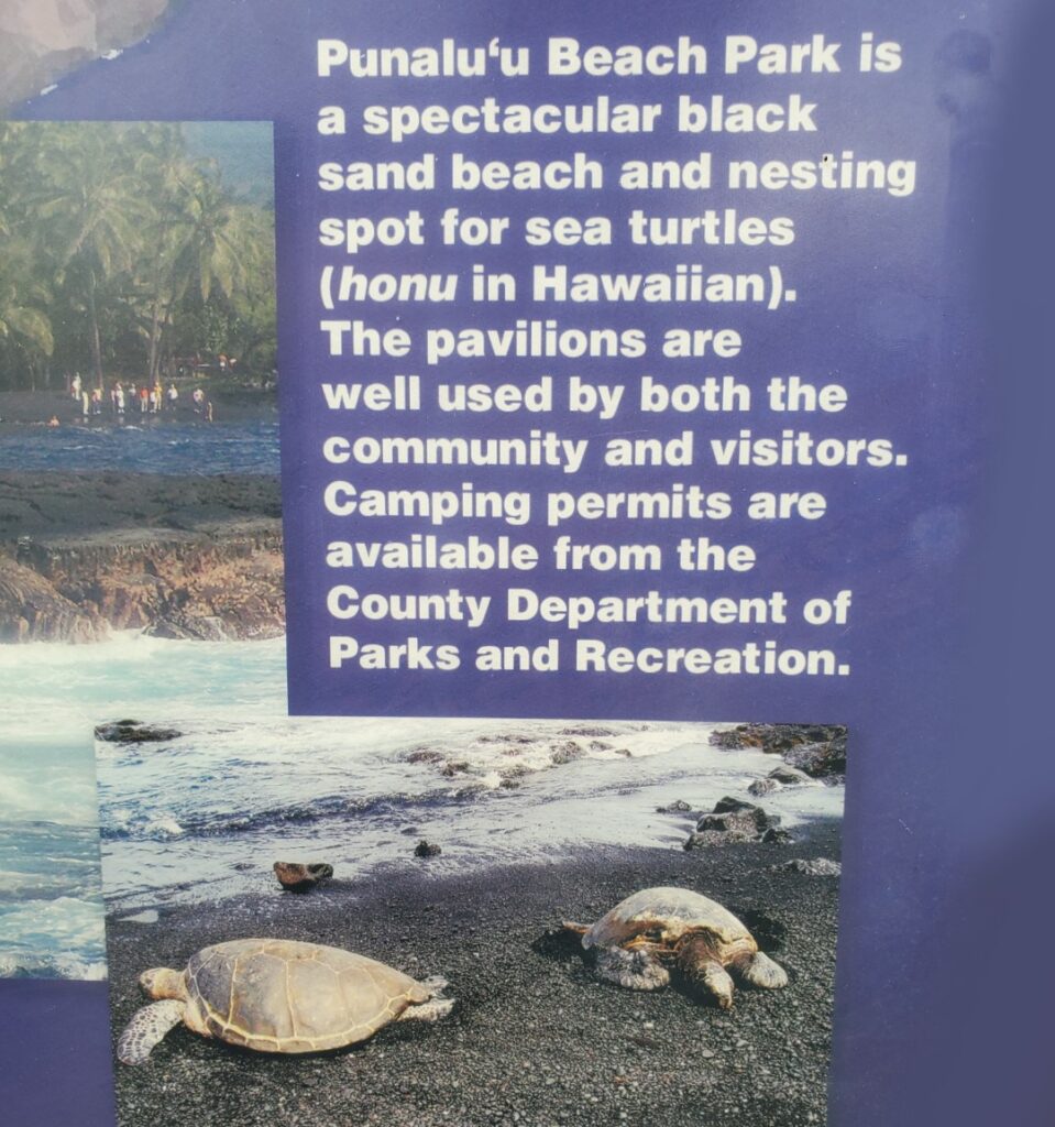 Punalu’u Beach Park has two parking lots, one at each end of the beach. The south lot is next to the restrooms and picnic areas. The north lot is near the stand and the pond. Creepy abandoned buildings behind the north end of the beach are from a restaurant that was closed down a few years back.