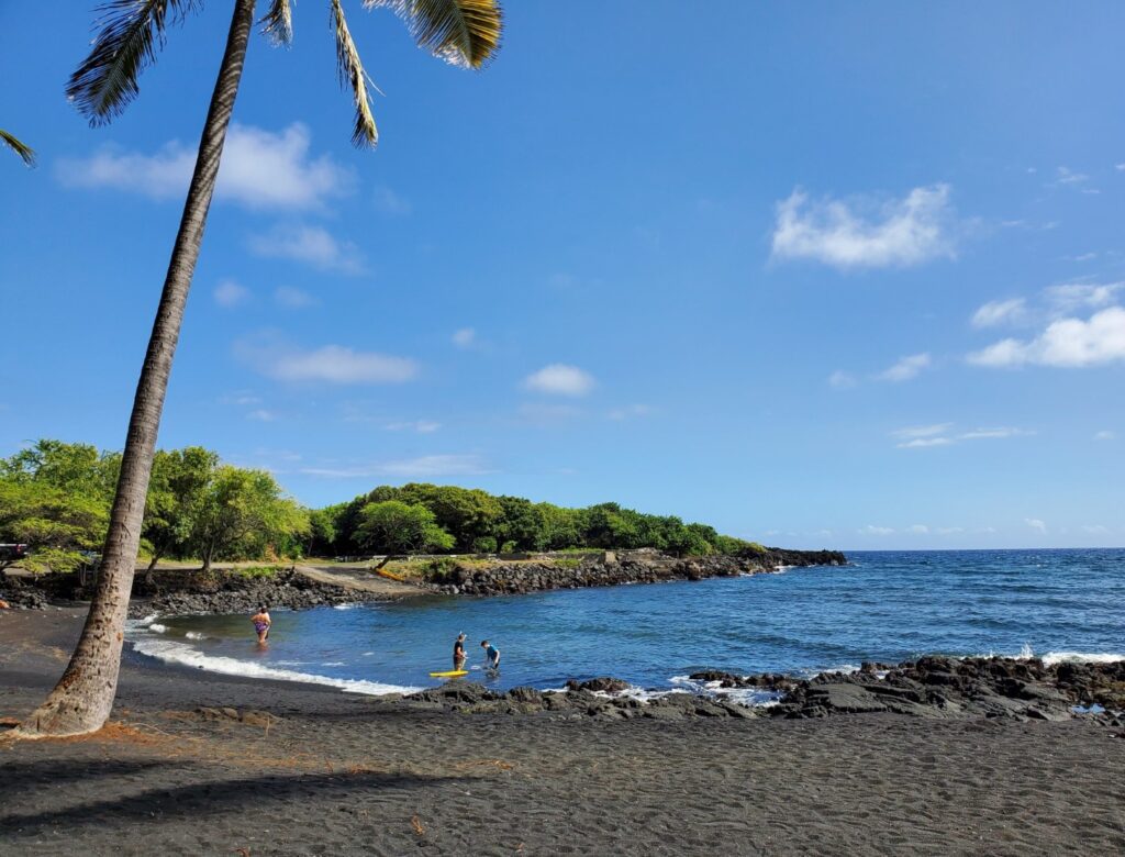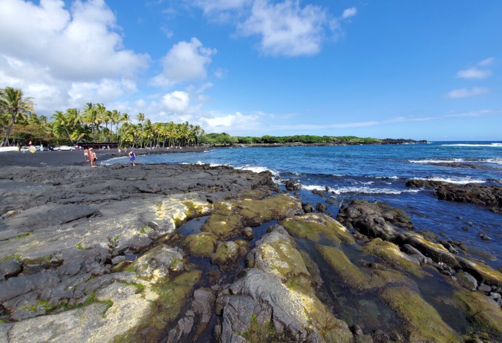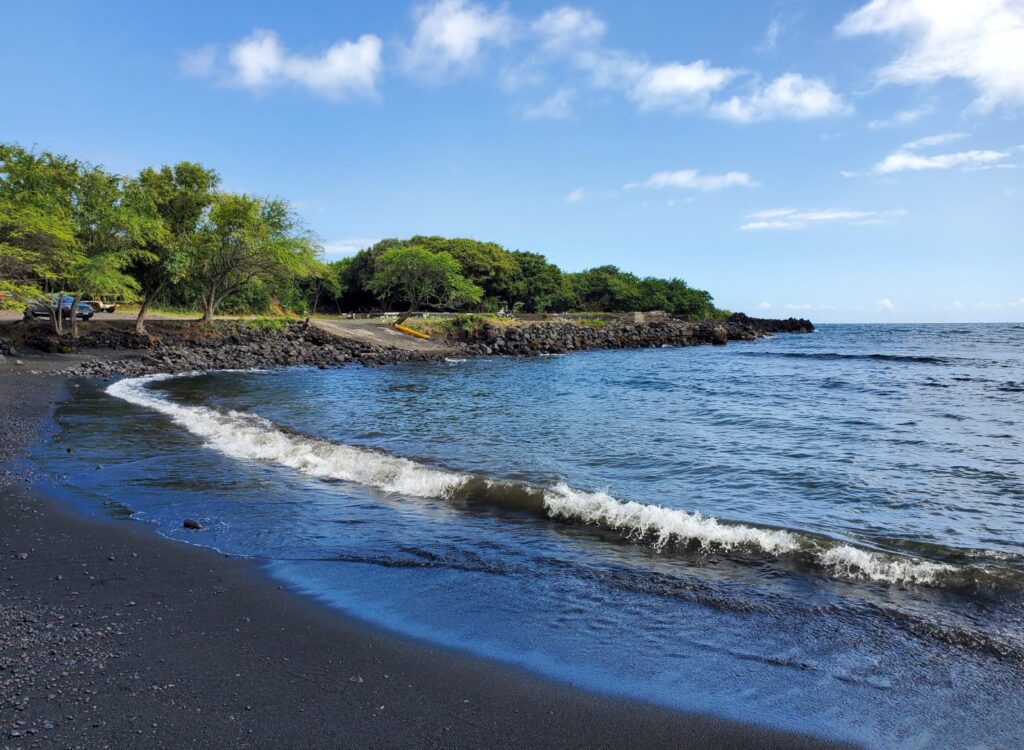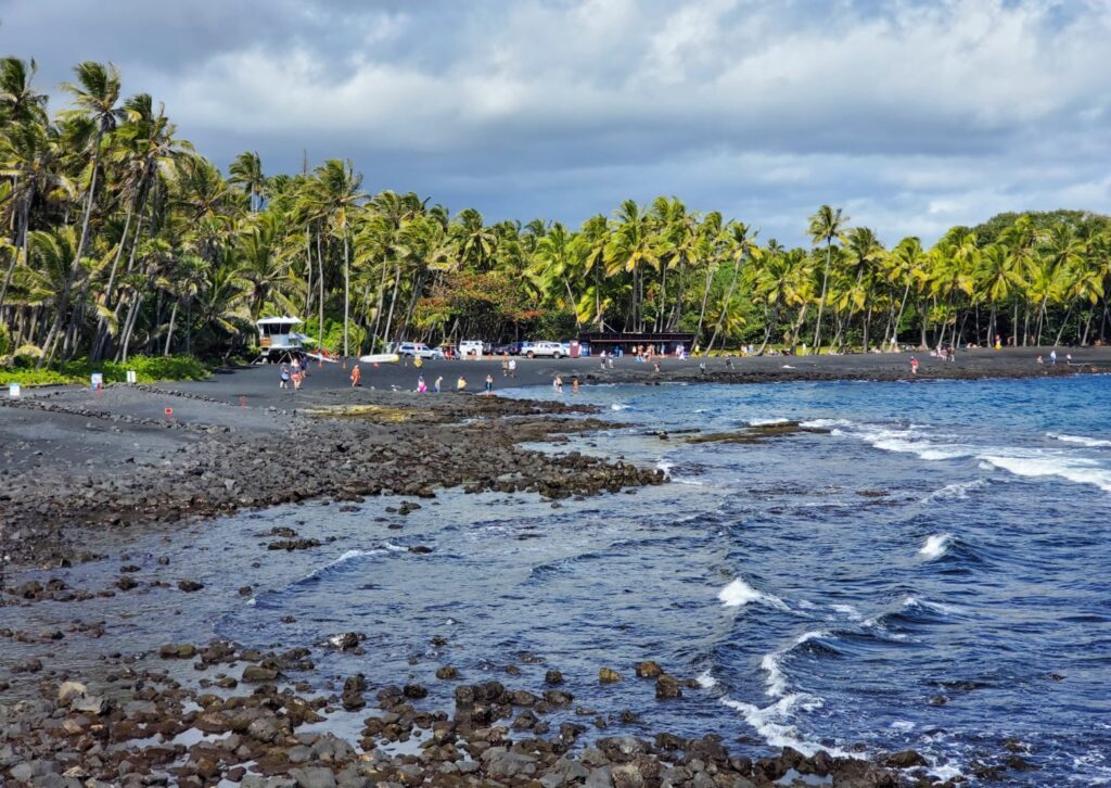 Punalu’u Black Sand Beach Park has a popular black sand beach with a large freshwater pond and rows of palm trees behind it. The setting is stunning and despite the distance from both Hilo and Kona, this beach can get busy.