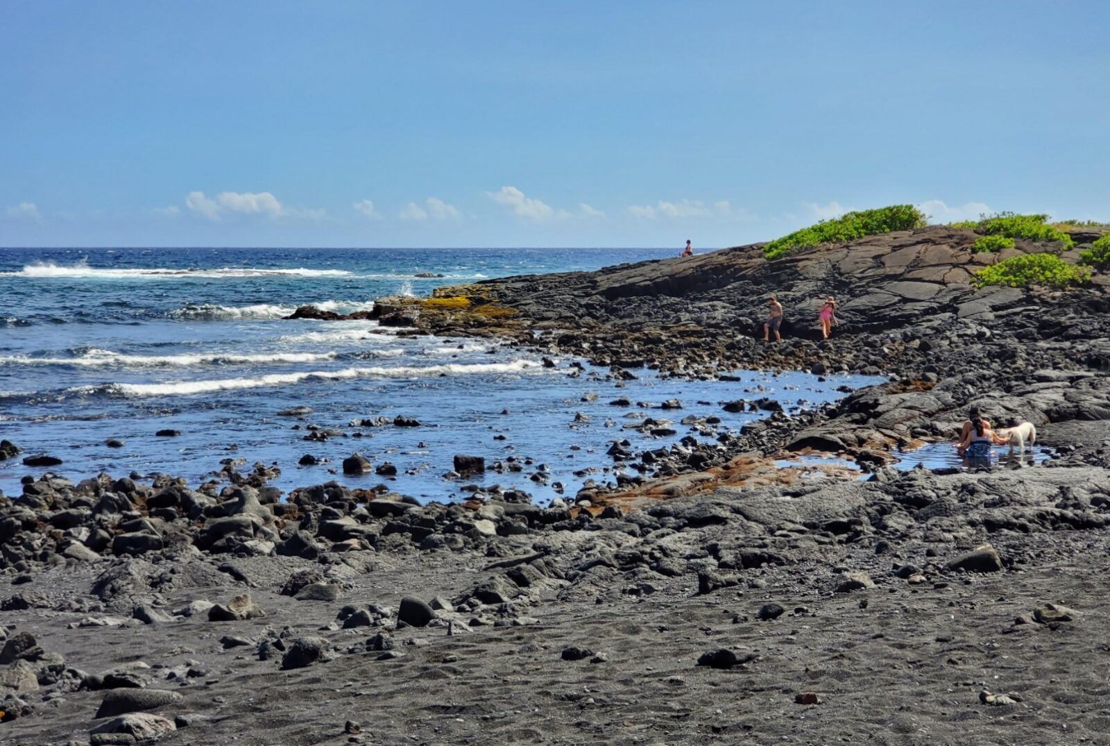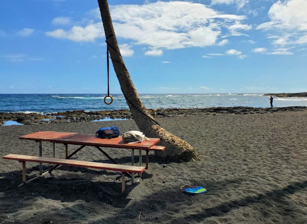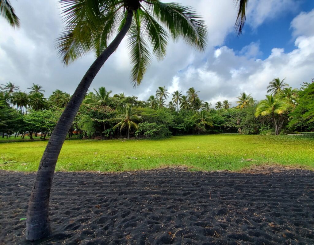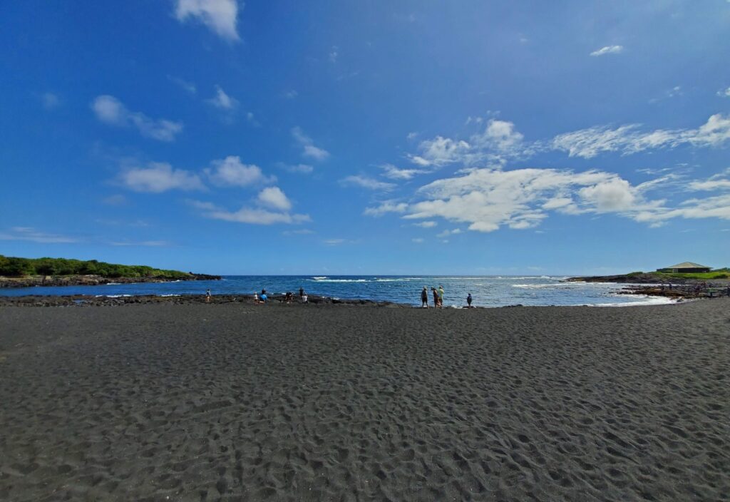 Punalu’u Black Sand Beach Park has a popular black sand beach with a large freshwater pond and rows of palm trees behind it. The setting is stunning and despite the distance from both Hilo and Kona, this beach can get busy.