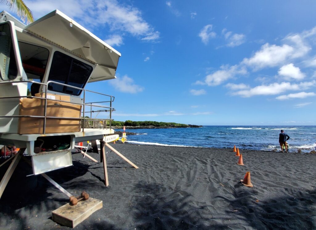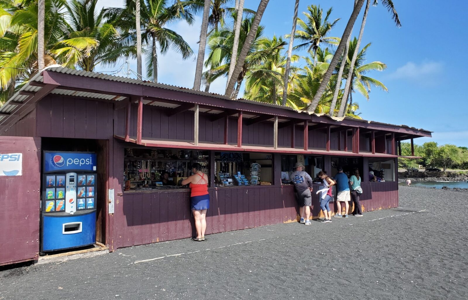 Swimming can be dangerous at Punalu’u due to rip currents. If you do swim, look out for turtles and stay back from them – a mask helps to see where they are. Note that the top layers of the water might seem colder as the freshwater from nearby springs seeps into the bay. Lifeguards are sometimes provided on busy weekend days, but don’t count on them being present when you get there. There’s a stand with souvenirs and a few snacks that might be open on weekends.
