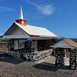 On the hill above Punaluu Beach you’ll find picturesque Hokuloa Church, a small open-air chapel surrounded by a cemetery. The unsigned path to this church begins across the road from the southern beach parking lot.
