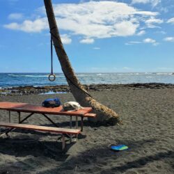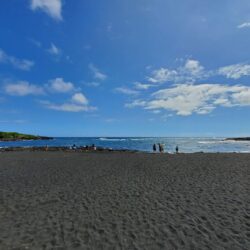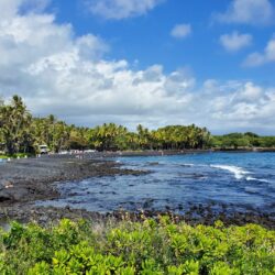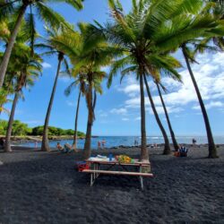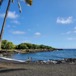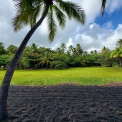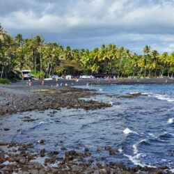 Punalu’u Black Sand Beach Park has a popular black sand beach with a large freshwater pond and rows of palm trees behind it. The setting is stunning and despite the distance from both Hilo and Kona, this beach can get busy.