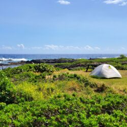 In the area by the boat ramp (east end of the beach) there are historical structures including the massive Punalu’u Nui Heiau (aka Kane’ele’ele Heiau). If you hike around up there, do not disturb walls or rock piles of any type or size as they could be a significant site. The trail that leads up to the heiau keeps going eastward all the way to remote Kamehame Beach (three miles one-way).