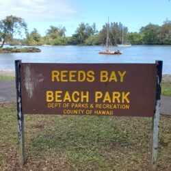 To get to Reeds Bay Beach Park drive or walk east on Kamehameha Avenue and then turn left onto Banyon Drive which leads directly to the park. Parking can be found along Banyon Drive and in a large parking lot near the restrooms.