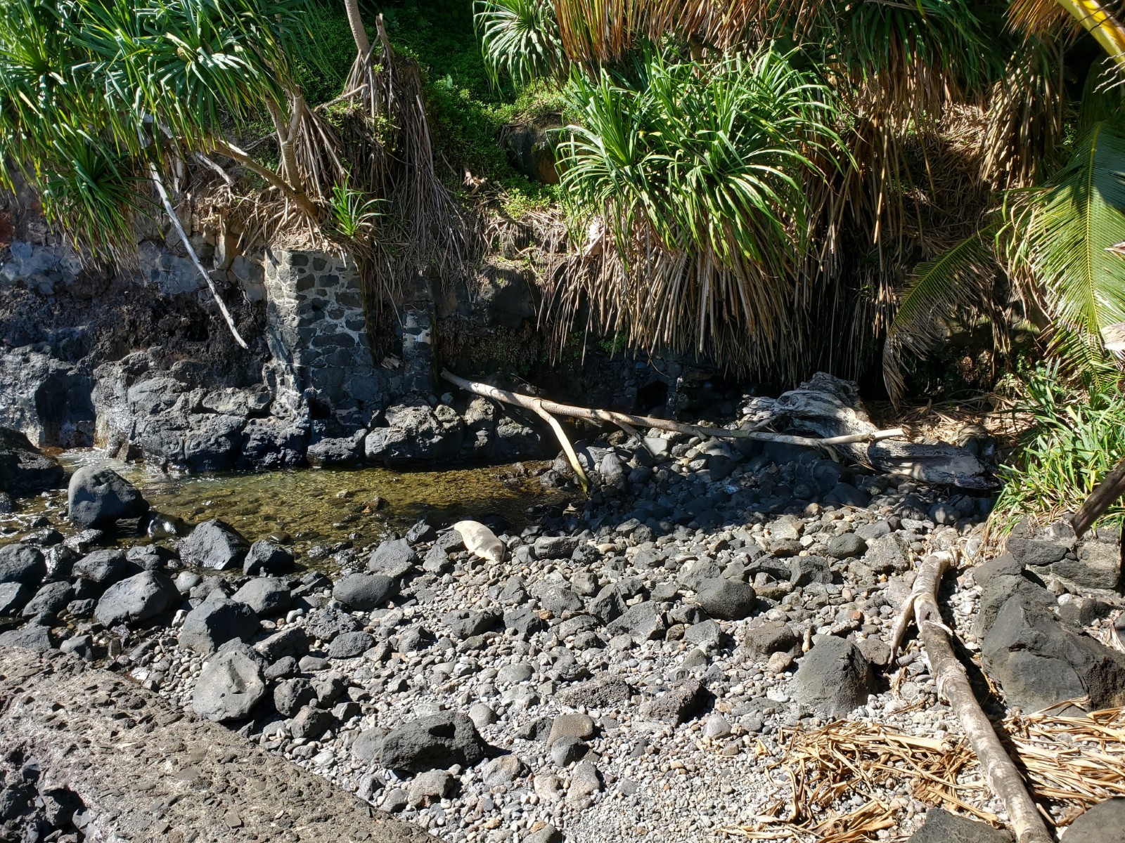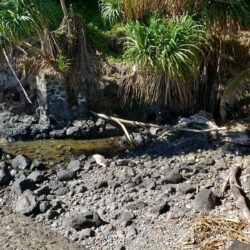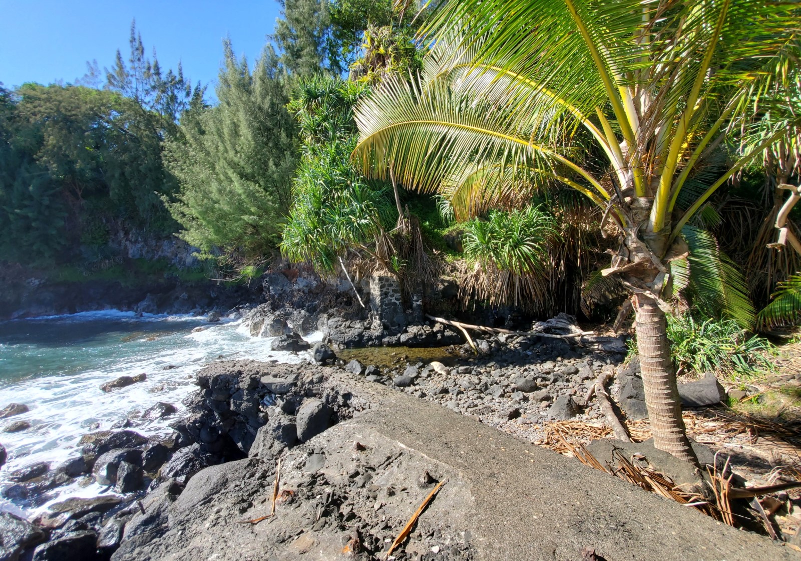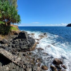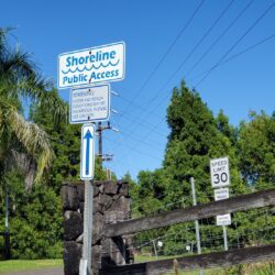 To get to this beach access, drive north from Hilo on the Hawaii Belt Road (Hwy 19) to just past the town of Pepeekeo where you’ll find Sugar Mill Road which is marked with a huge green gear from the old mill. Turn right there and follow it to the end at about 1.4 miles from the highway. On the way you’ll pass the old Pepeekeo Sugar Company building from 1920. At the trailhead there’s a white and blue “Shoreline Public Access” sign pointing the way. Access hours are 6am to 6pm daily.
