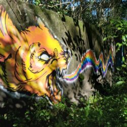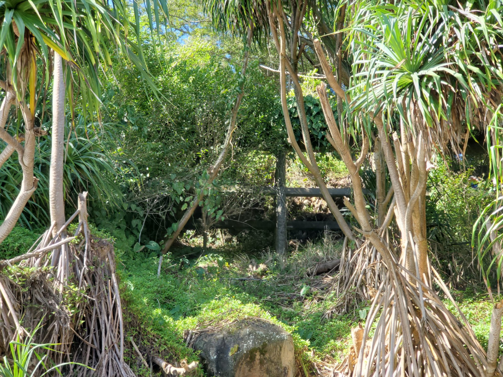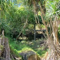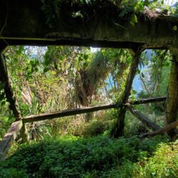 The trail down the hill from the trailhead is very steep and that’s an understatement. There are sections where you’ll have to hold onto vegetation and lower yourself without seeing what’s below. And it’s easy to slip as this area is frequently wet. We only suggest going when the trails are dry and if you are comfortable climbing down (and back up) such a steep grade. On the way down you’ll pass an old structure left over from the sugar mill days and a concrete wall with unique spray paint art.