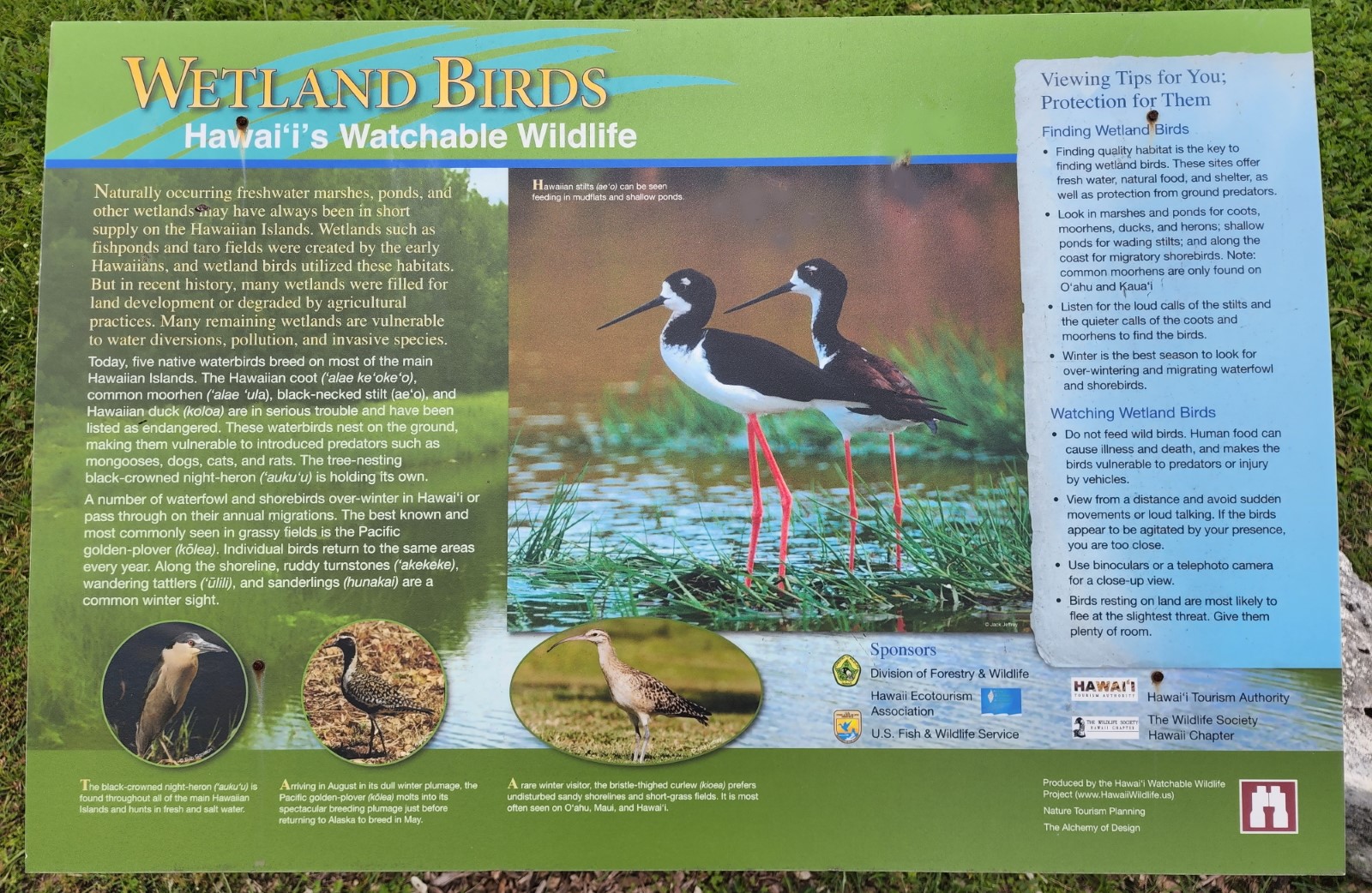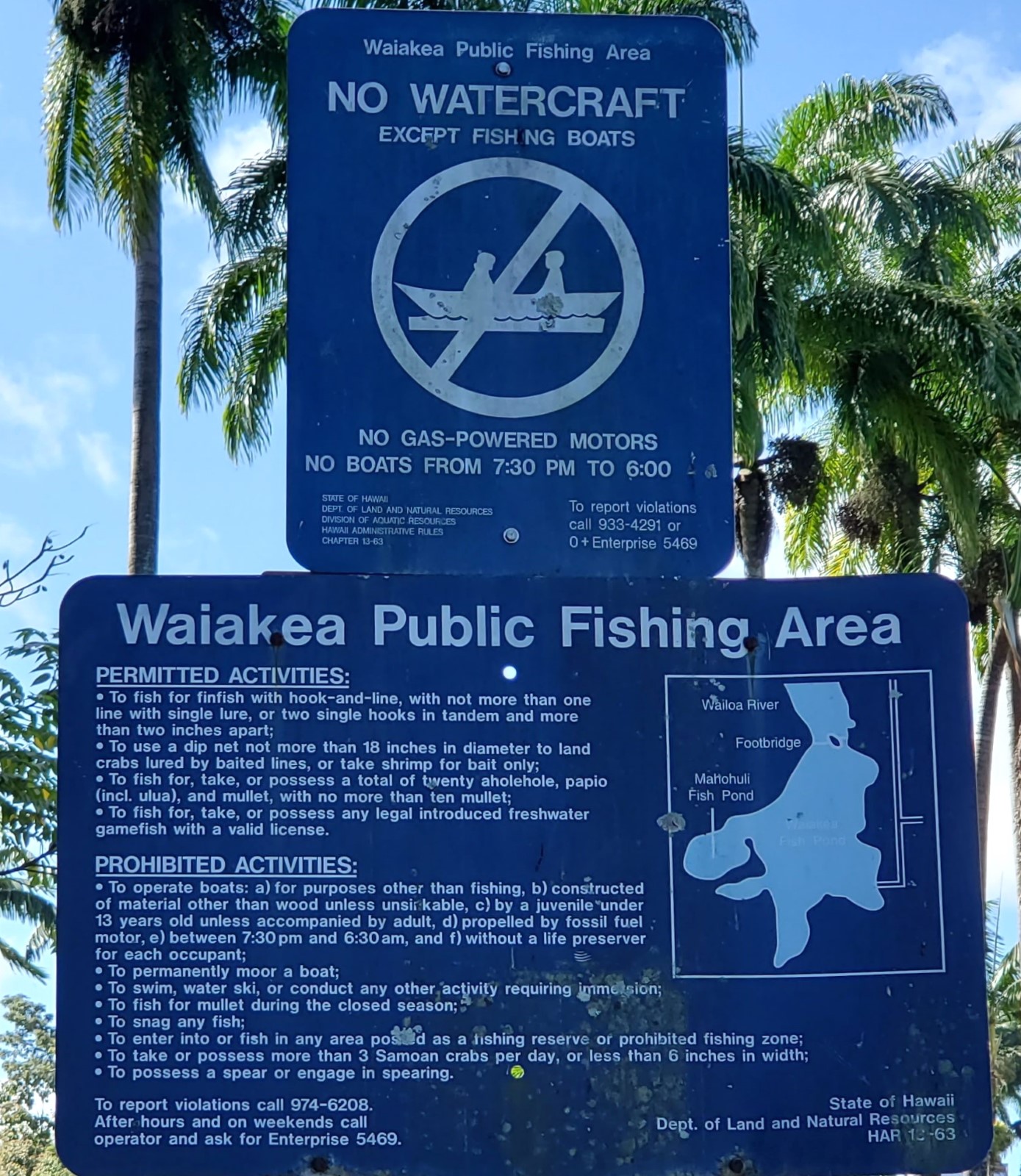 The estuary in this park includes Waiakea Pond and Wailoa River and it opens up to the ocean at Hilo Bay next to Hilo Bayfront Beach. The water-use rules vary for the north and south parts of this estuary. Waiakea Pond and Waiakea Public Fishing Area is defined as the area south of the east-west undulating footbridge that crosses over a small island. In the “pond”, swimming and any other activity requiring immersion in the water is prohibited. But fishing is allowed from shore or from a non-motorized boat that is wooden or “unsinkable”. Signs in the area describe the fishing rules clearly (see our photos). North of the east-west footbridge the water is considered Wailoa River, an area where kayaking and stand-up paddleboarding are allowed.