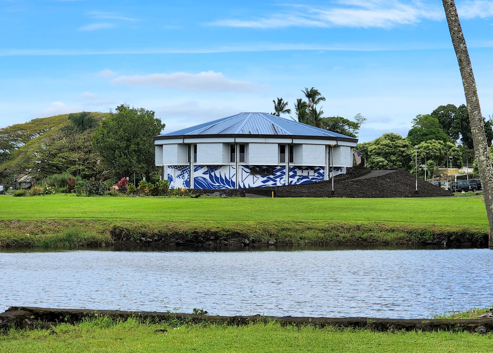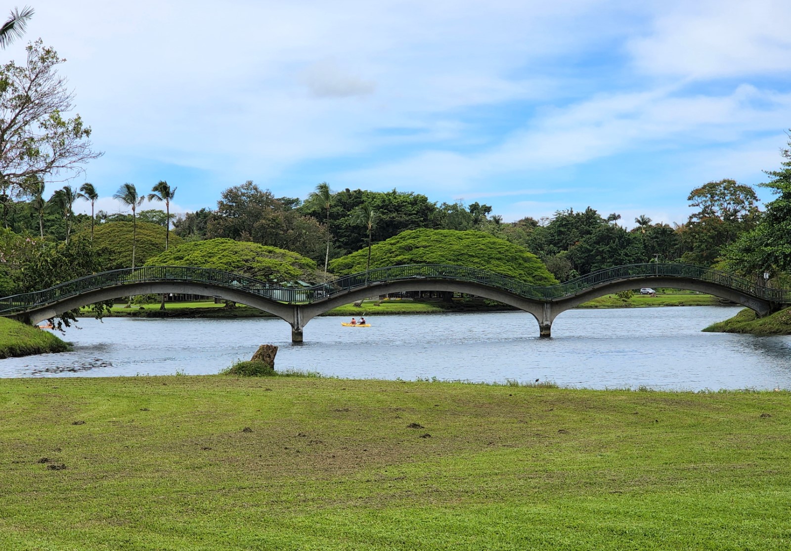 The east side of the park has a large parking lot with an entrance from Piilani Street. On that side you’ll find ample picnic facilities, walking paths, and a boat ramp. The west side of the park is entered from Piopio Street and is signed “Wailoa Center”. There you’ll find a Korean War Memorial, a Vietnam Memorial, the Shinmachi Tsunami Memorial, and Wailoa Art Center, a free public facility that hosts art galleries and cultural exhibits. From the park’s west side an undulating pedestrian bridge goes over to the north side of the park where you’ll find a statue of Kamehameha The Great.