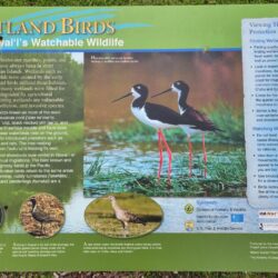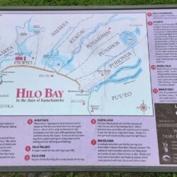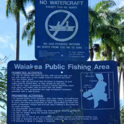The estuary in this park includes Waiakea Pond and Wailoa River and it opens up to the ocean at Hilo Bay next to Hilo Bayfront Beach. The water-use rules vary for the north and south parts of this estuary. Waiakea Pond and Waiakea Public Fishing Area is defined as the area south of the east-west undulating footbridge that crosses over a small island. In the “pond”, swimming and any other activity requiring immersion in the water is prohibited. But fishing is allowed from shore or from a non-motorized boat that is wooden or “unsinkable”. Signs in the area describe the fishing rules clearly (see our photos). North of the east-west footbridge the water is considered Wailoa River, an area where kayaking and stand-up paddleboarding are allowed.