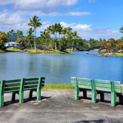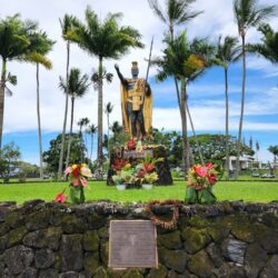 The east side of the park has a large parking lot with an entrance from Piilani Street. On that side you’ll find ample picnic facilities, walking paths, and a boat ramp. The west side of the park is entered from Piopio Street and is signed “Wailoa Center”. There you’ll find a Korean War Memorial, a Vietnam Memorial, the Shinmachi Tsunami Memorial, and Wailoa Art Center, a free public facility that hosts art galleries and cultural exhibits. From the park’s west side an undulating pedestrian bridge goes over to the north side of the park where you’ll find a statue of Kamehameha The Great.